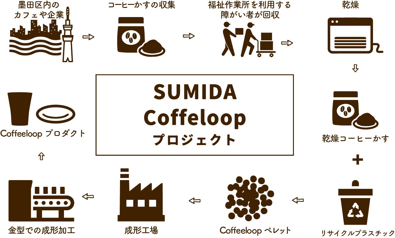 「すみだCoffeeloopプロジェクト」は、墨田区資源環境部資源循環推進担当との連携のもと、区内のカフェなどから出たコーヒーかすを回収し、「すみだCoffeeloopプロジェクト」オリジナルロゴの「Coffeeloopカップ」を開発するものです。原料となるコーヒーかすの回収は墨田区内の福祉作業所に担っていただくことで、障がい者の方の多様な就労機会の創出にも貢献します。10月からコーヒーかすの回収を実施し、11月にカップの製造、12月中旬頃から区内のカフェなどでカップの利用を開始します。店内で何度も使用した後に劣化・破損したカップはアサヒユウアスが引き取り、カップの状況を見てマテリアルリサイクルか再塗装を施すことで、新たなカップに作り替え、再利用します。今後、賛同するカフェや企業を募りながら、墨田区内のサーキュラーエコノミーを構築し、持続可能な資源利用を推進します。