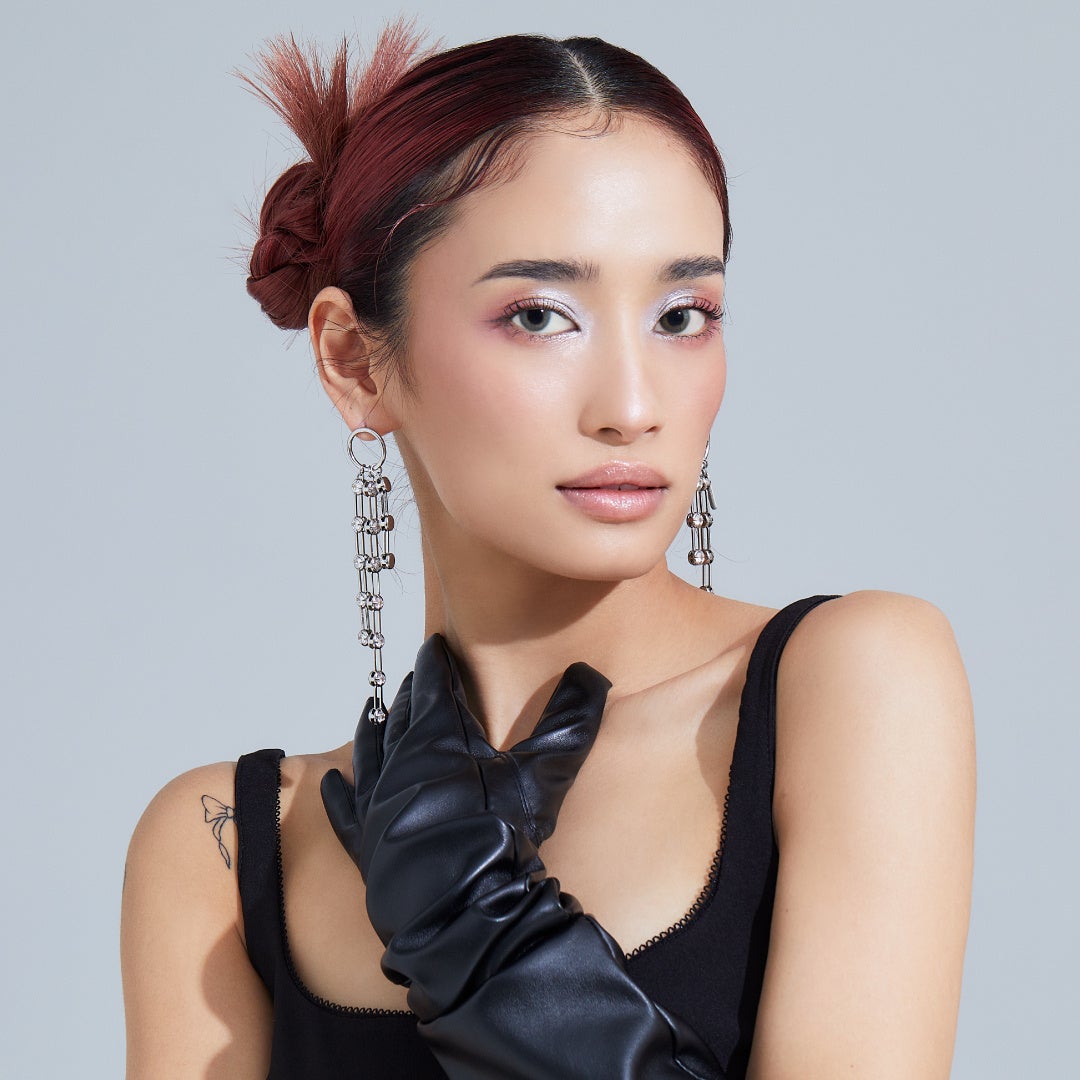 くすみカラーにきらめきを仕込み、エッジを効かせた洒落見えレンズ。