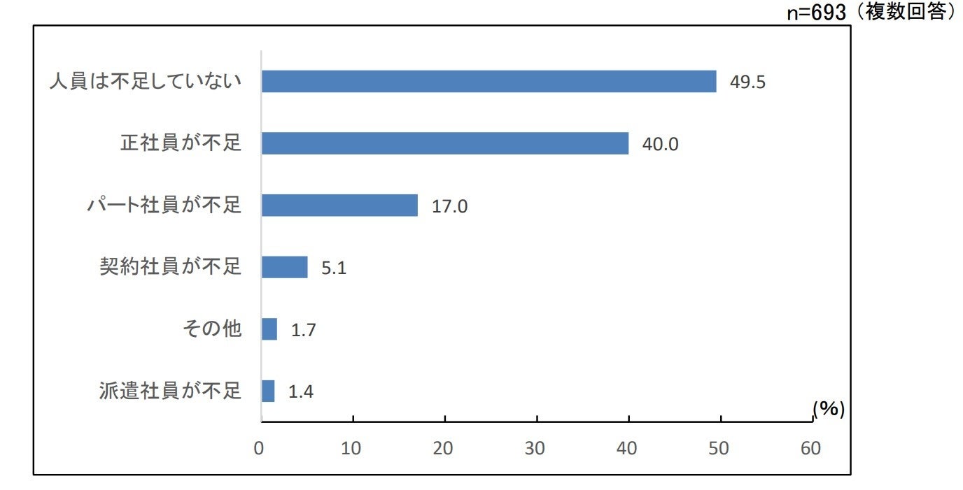 現在の人員について、「正社員が不足」は40.0%、「パート社員が不足」は17.0%、「契約社員が不足」は5.1%、「派遣社員が不足」1.4%となり、半数超が人手不足となりました。従業員数が多くなるほど正社員が不足する傾向が見られます。