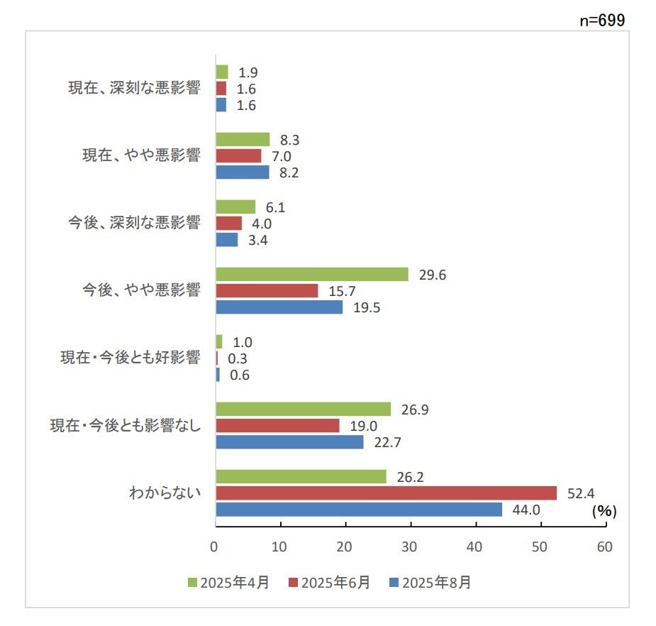 トランプ関税による影響は、6月調査時と比較して、現在の悪影響は9.8%(6月比+1.2ポイント)、今後の悪影響は22.9%(6月比+3.2ポイント)となり、悪影響への不安は未だ消えていません。特に製造業と卸売業では悪影響を懸念する声が多く聞かれます。