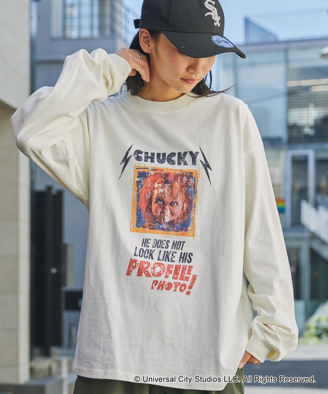 [商品名]【CHUCKY】H.チャッキーフォトプリント&袖ロゴプリントロンT