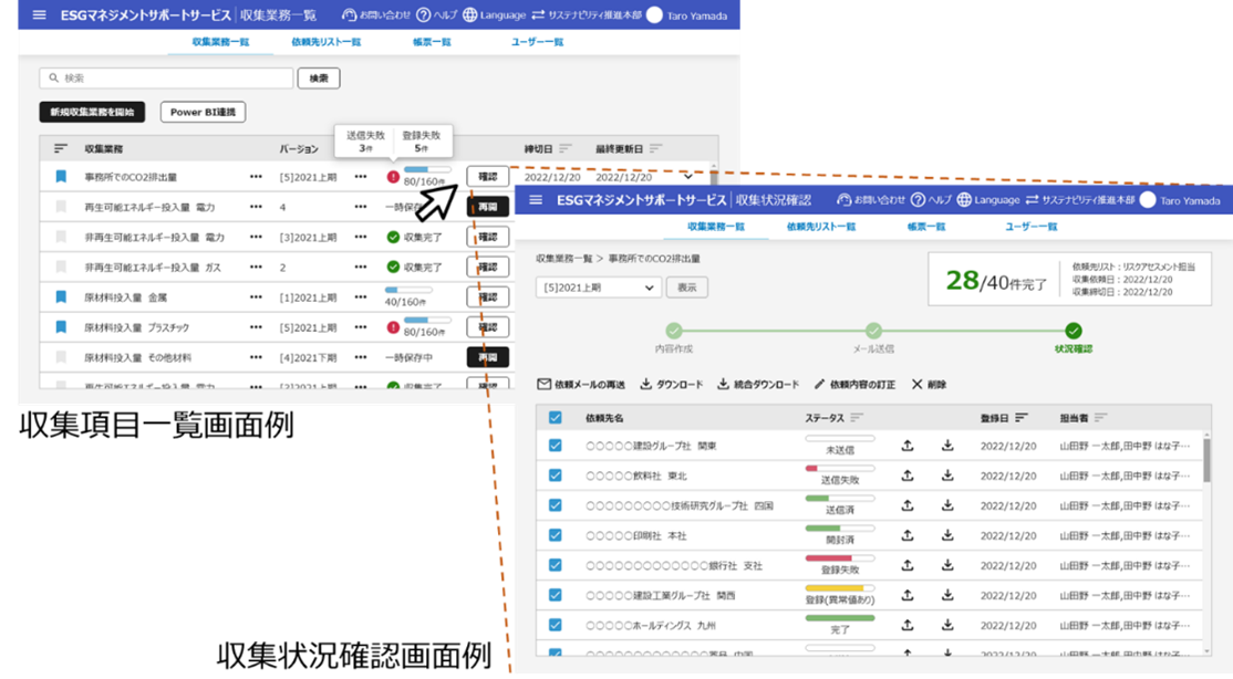 メールやExcelなど既存の仕組みを活用したESGデータの入力・管理ツールを提供し、作業者が使いやすい形で収集業務を効率化します。システム経由で、収集したい情報の定義(作成)から、依頼メールの一斉送信、収集先における必要項目の入力・返送など、データの収集・管理を手間なく実施できます。各部署から収集したファイルは自動でデータベースに取り込まれ、業務ごとに集計・一元管理されるほか、収集データを活用できます。