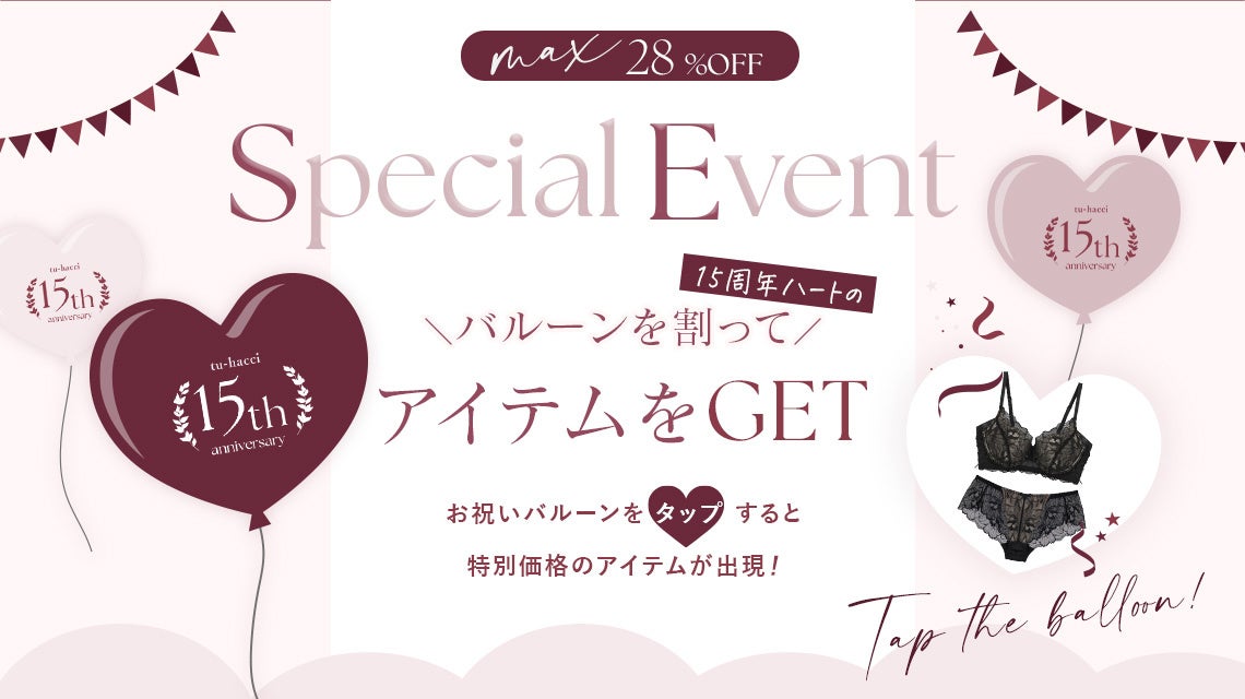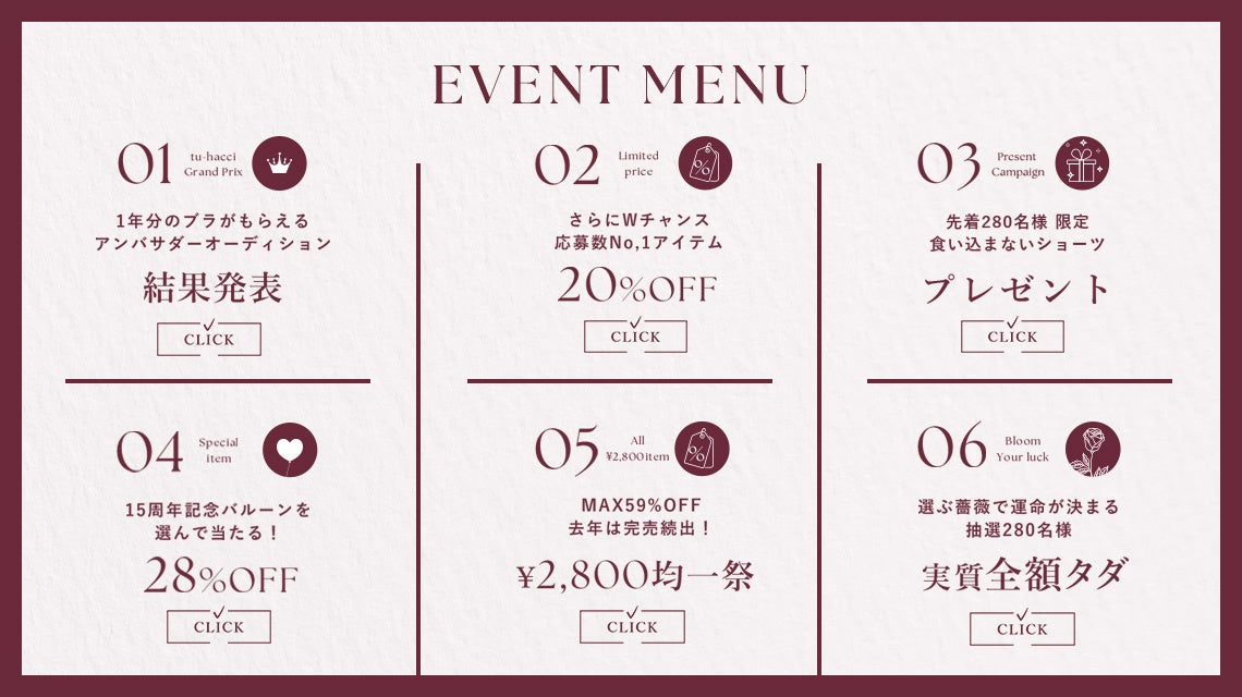 15周年ローズが届くと実質全額タダになる『Bloom Your Luck』や、優勝者にブラ1年分がプレゼントされる『tu-hacciグランプリ』の結果発表など、特別企画を多数ご用意しております。