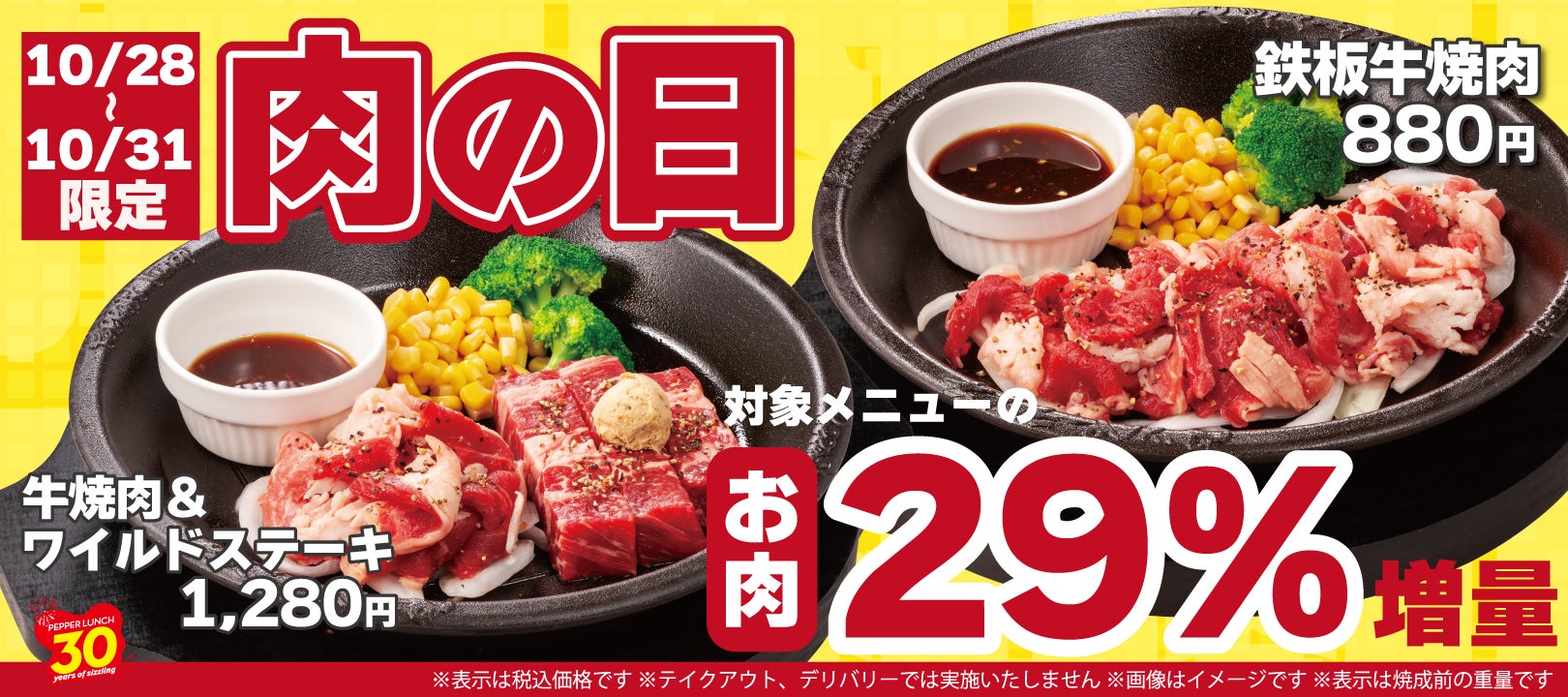 株式会社ホットパレット(本社:東京都江東区、代表取締役社長:松本純男)が展開するペッパーランチは29日「肉の日」を拡大して、10月28日(月)~10月31日(木)の期間、「鉄板牛焼肉」と「牛焼肉&ワイルドステーキ」のお肉の量を29%増量して販売いたします。