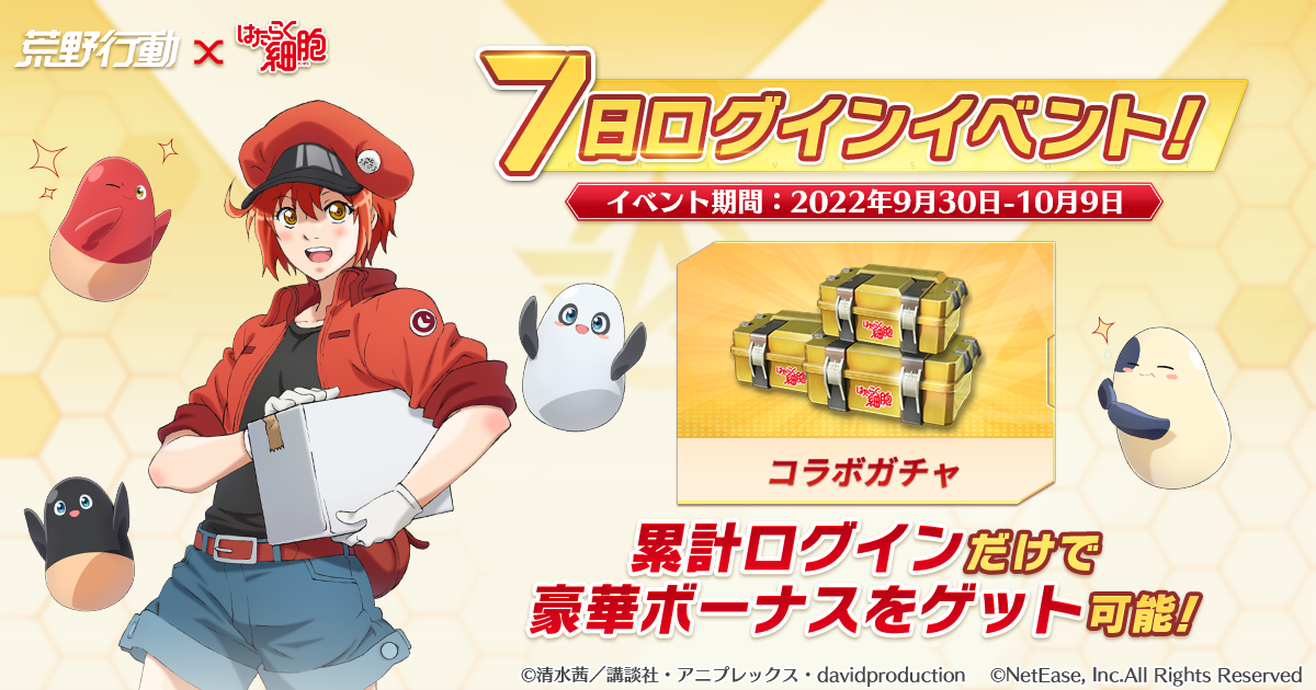 NetEase Gamesが開発・運営する大人気バトルロワイヤルゲーム『荒野行動』にて、2022年9月30日10:00から2022年10月13日23:59の期間中、『はたらく細胞』とのコラボイベントを開催いたします。