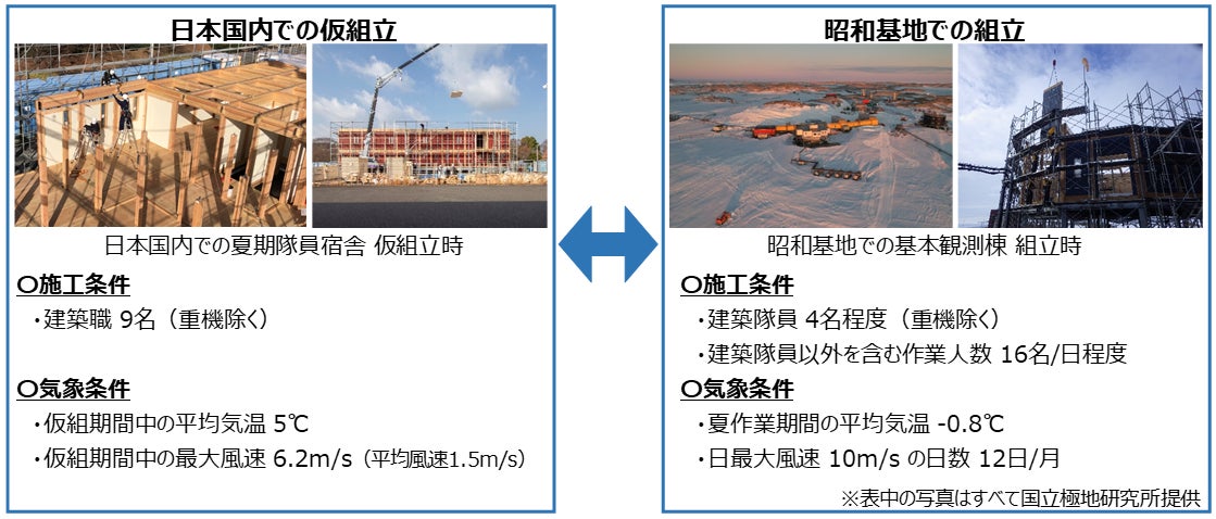昭和基地の建築物は、施工可能性および建設工程の確認のために事前に国内で仮組立・検証を行い、解体作業を経て昭和基地に納品され、再度組立を行います。このように、同じ建物を異なる施工条件・気象条件で建設する特殊な方法を活用して研究・開発を実施します。