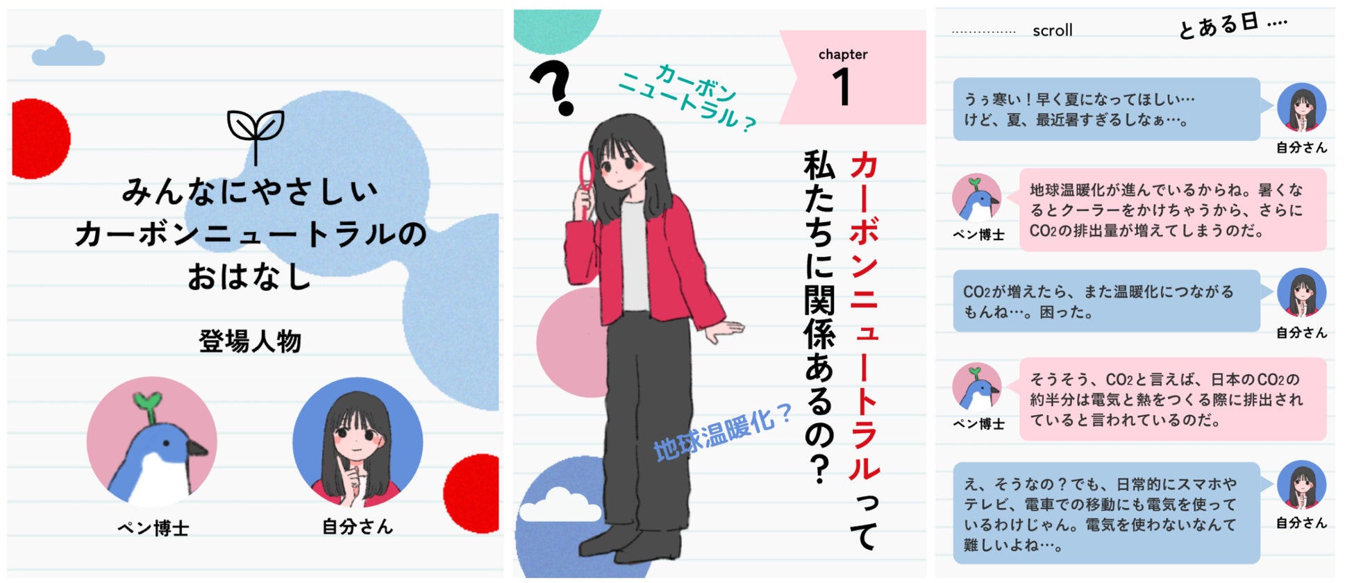 Webコンテンツは、「カーボンニュートラルという言葉は知っているけど、詳しくはわからない」という方でも、気軽に学べる設計に。登場するのは、博識なペンギン「ペン博士」と素直で好奇心いっぱいの「自分さん」。このキャラクターたちが繰り広げる会話を通して「カーボンニュートラルって何だろう?」「私たちの生活とどう関係があるの?」といった素朴な疑問を、やさしく解きほぐしていきます。