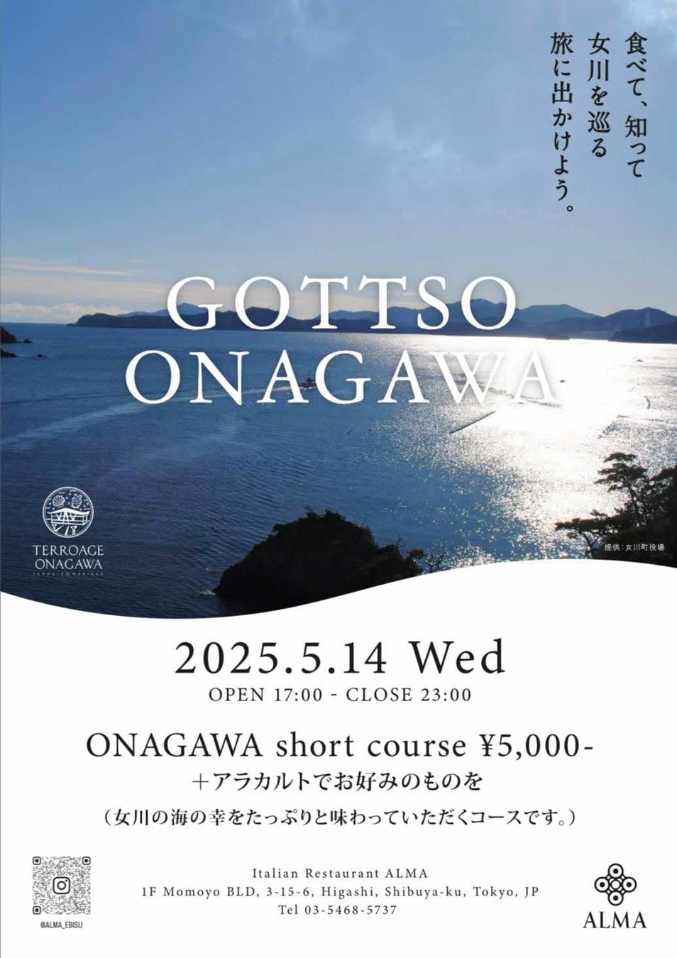 東京・恵比寿の東北イタリアン「ALMA(アルマ)」(運営:CLASSIC INC.、代表取締役 : 萱場俊克、本社:東京都渋谷区)は、2025年5月15日(木)から6月14日(土)までの1ヶ月限定で宮城県女川町とコラボした特別なフェア「GOTTSO ONAGAWA 2025」をご提供いたします。それに先駆け前日の5月14日(水)には、女川町長や生産者さんを招待したイベントも開催いたします。女川町の鮮魚を使用した魅力たっぷりのコースをぜひお楽しみください。