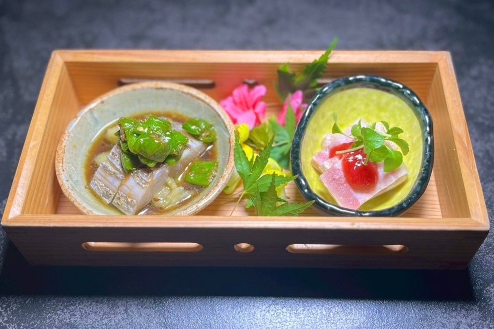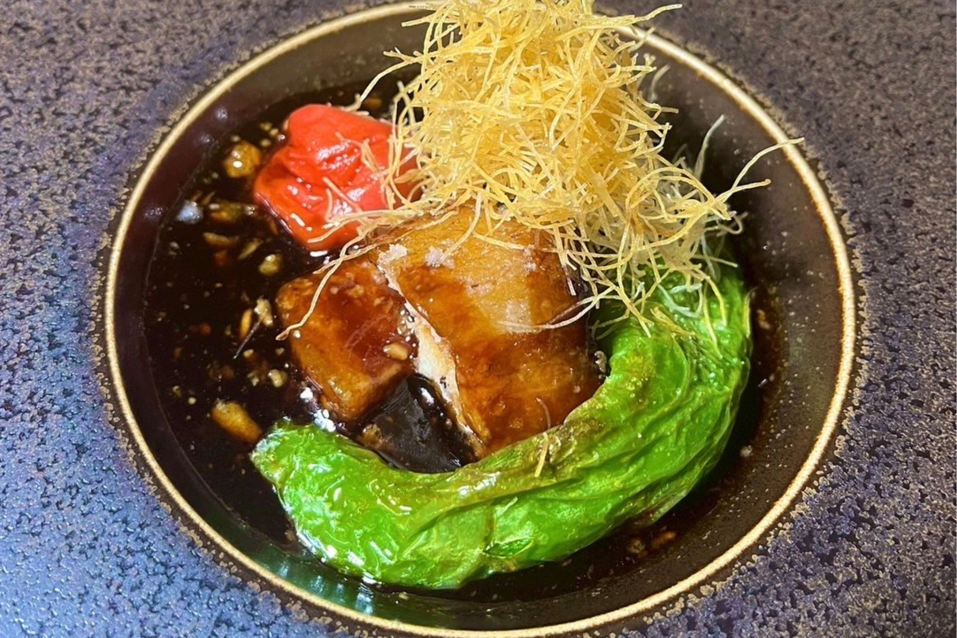 SPF岩中豚を低温で3〜4時間、じっくりと火入れしたとろける角煮。南高梅と黒酢にぶどう果汁を合わせた特製ソースは、爽やかな酸味と自然な甘みが絶妙に調和し、従来の角煮の概念を覆す"新感覚"の仕上がりに。京野菜の万願寺唐辛子が添えるほのかな辛味と香りが余韻を美しく彩り、まさに"和の風情"を感じる贅沢な逸品です。