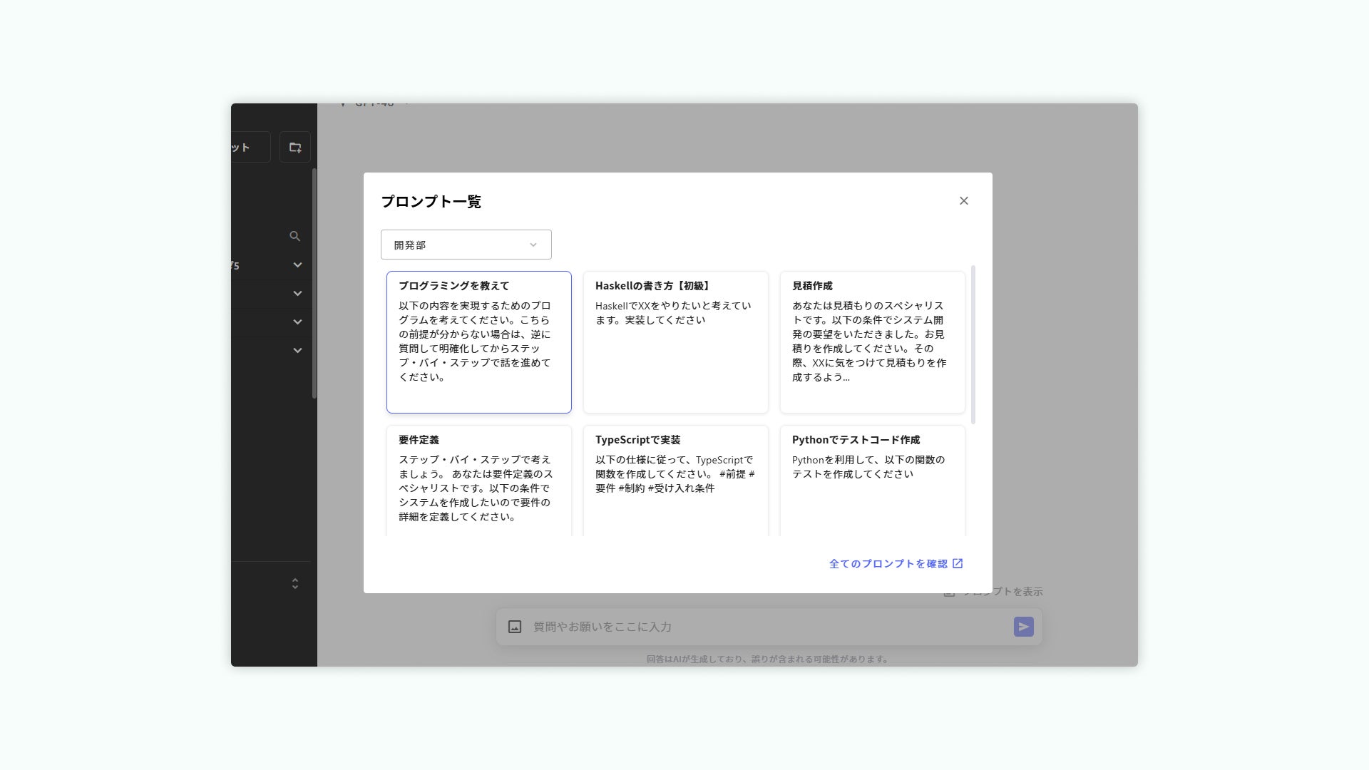 しかしこれまで、プロンプトを呼び出すためには、一度、別の画面に遷移して利用する必要がございました。これに対し、ご利用中のユーザー様からは、「より簡単に、普段のチャット画面からテンプレートを呼び出せるようにしたい」というご要望をいただいておりました。ChatSenseでは、「大企業の知的活動を最速にする」ことをミッションとしてサービスをしております。この度、ユーザー様からの要望をもとに、知的活動をより簡単に、素早く行えるようにするために、プロンプトの呼び出し方法を大きく変更いたしました。これにより、これまで以上に簡単に「組織のプロンプト」を呼び出すことが可能になりました。
