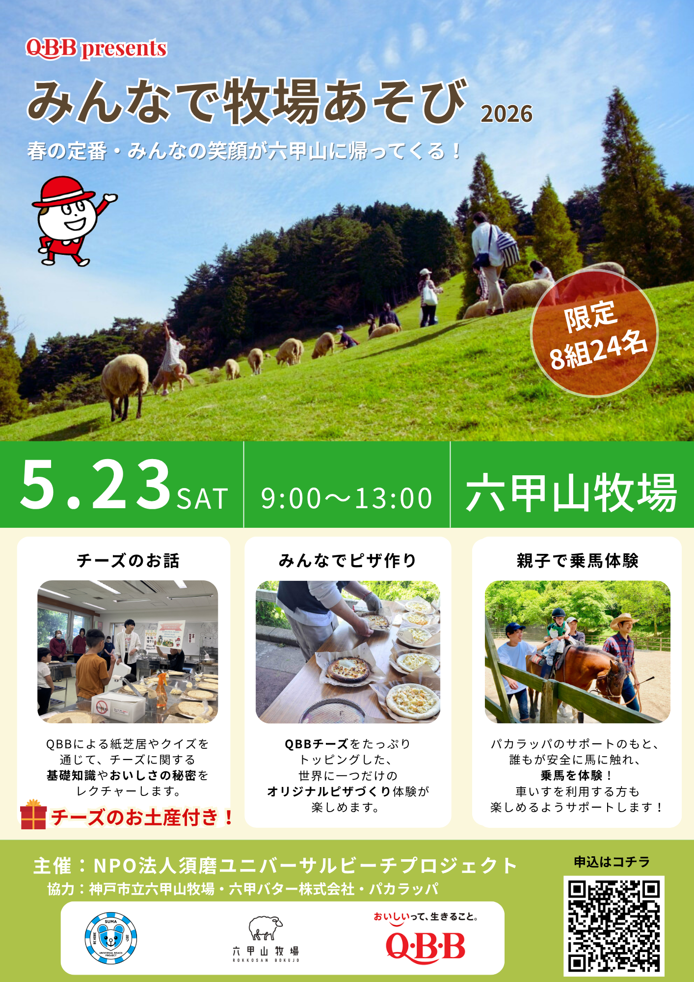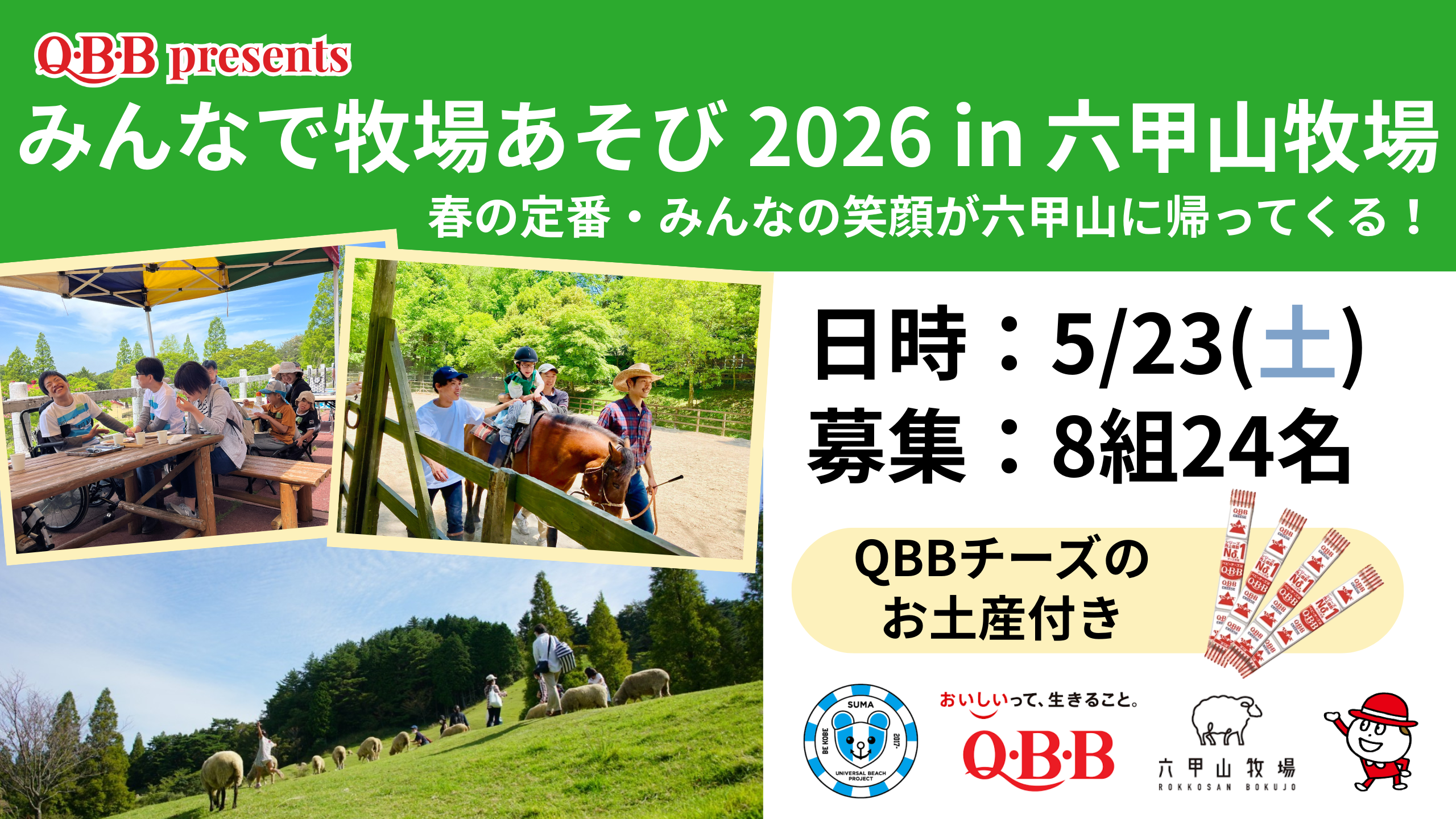 障がいがある人もない人も、誰もが一緒に楽しめるビーチづくりを目指すNPO法人須磨ユニバーサルビーチプロジェクトは、神戸市立六甲山牧場、六甲バター株式会社(以下、QBB)、障がい者乗馬サークル「パカラッパ」のご協力のもと、2026年5月23日(土)にQBB presents『みんなで牧場あそび2026 in 六甲山牧場』