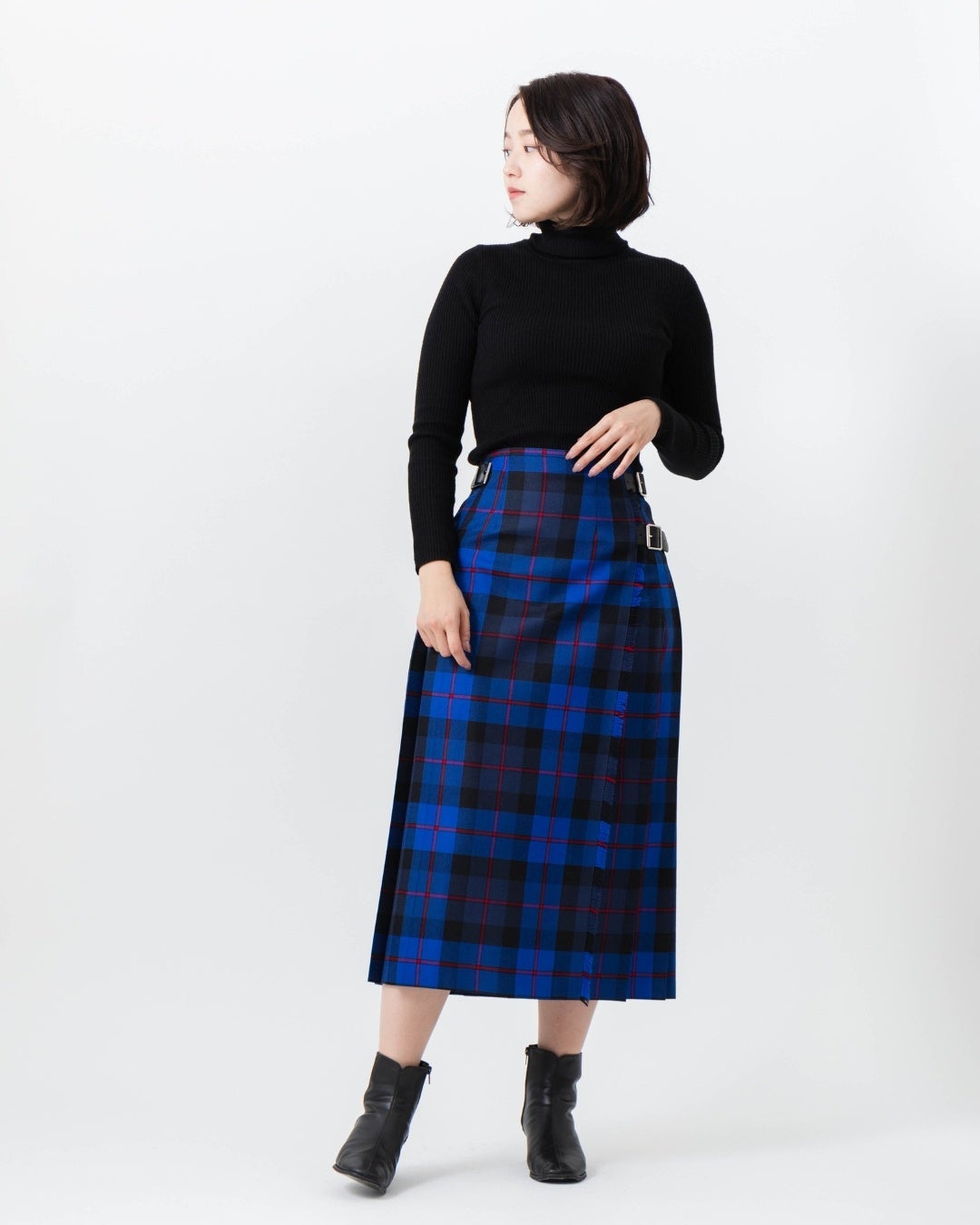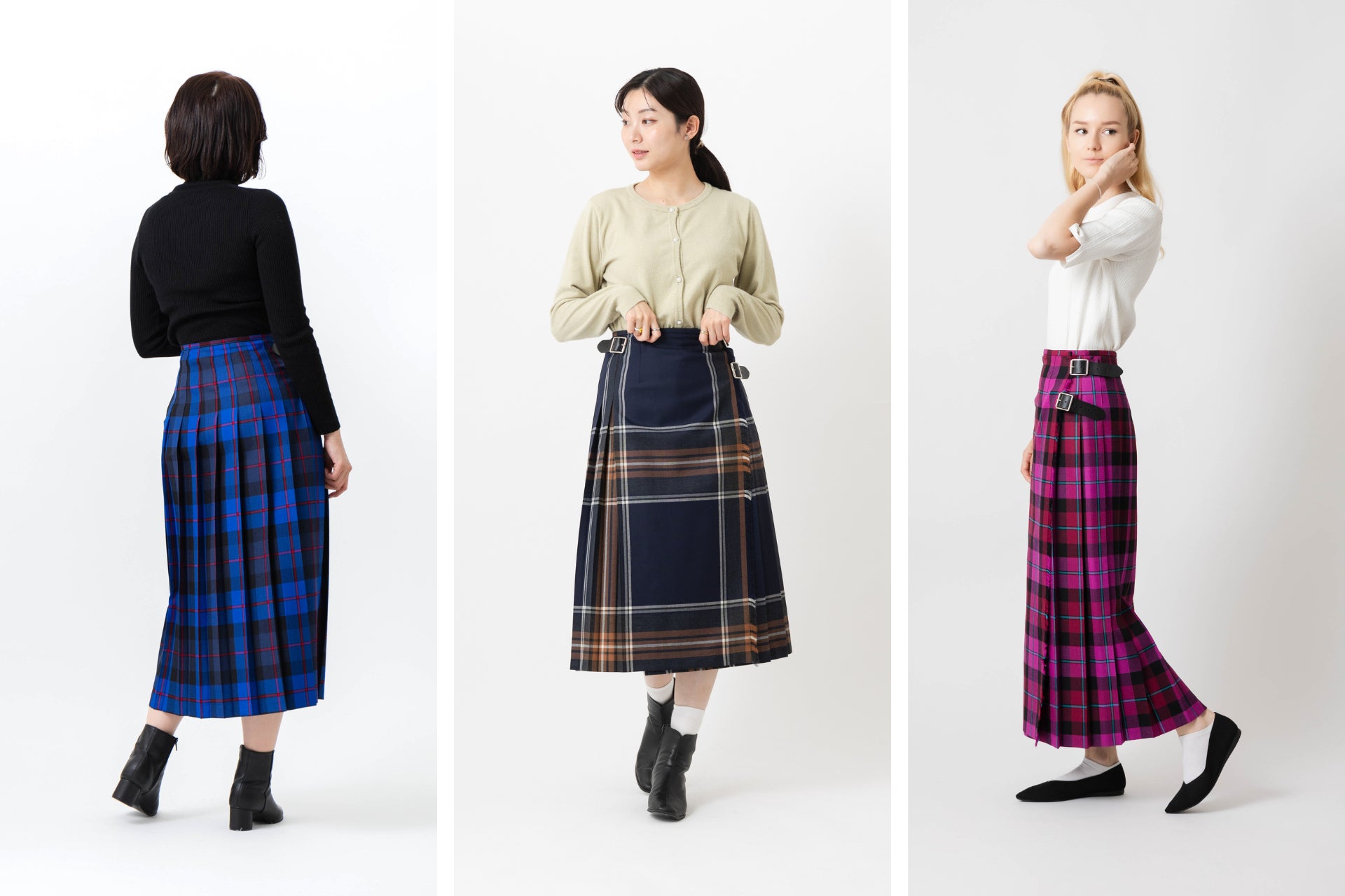 バリエーション豊かなタータンチェックのキルトスカートを展開します。