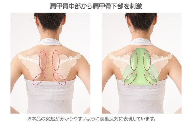 逆三角形に使用することで、肩~肩甲骨内側真ん中あたりまでをケアすることが出来ます♪背筋から肩甲骨にかけてピッタリとフィットする形状になるよう設計と試作を繰り返しました。