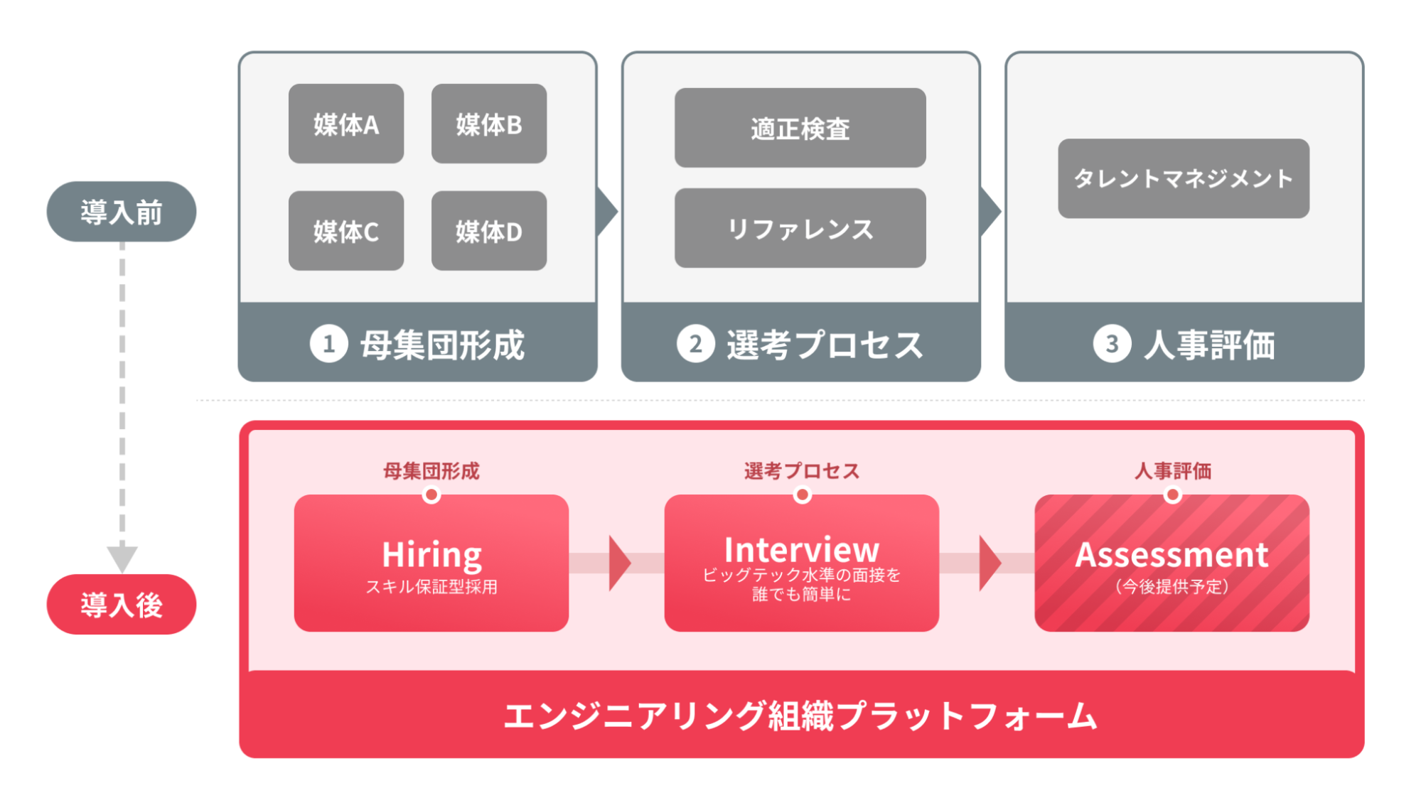 さらに、AIを活用した次世代の採用活動を見据え、選考の見送り理由や評価コメントを構造化データとして蓄積する機能を搭載。将来的には、より適切な人材を、より多くの企業にマッチングできるよう、「AIマッチング機能」を強化してまいります。