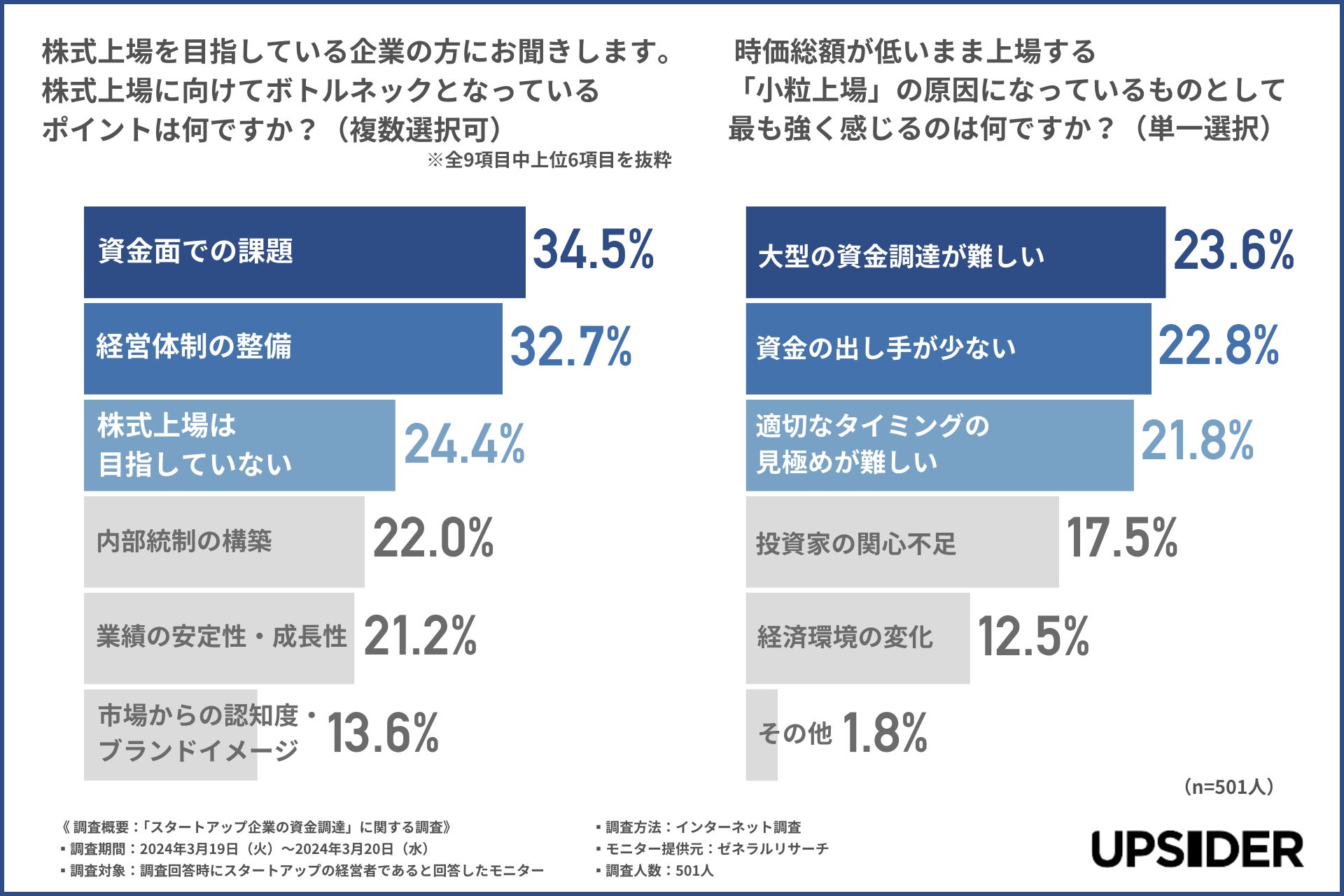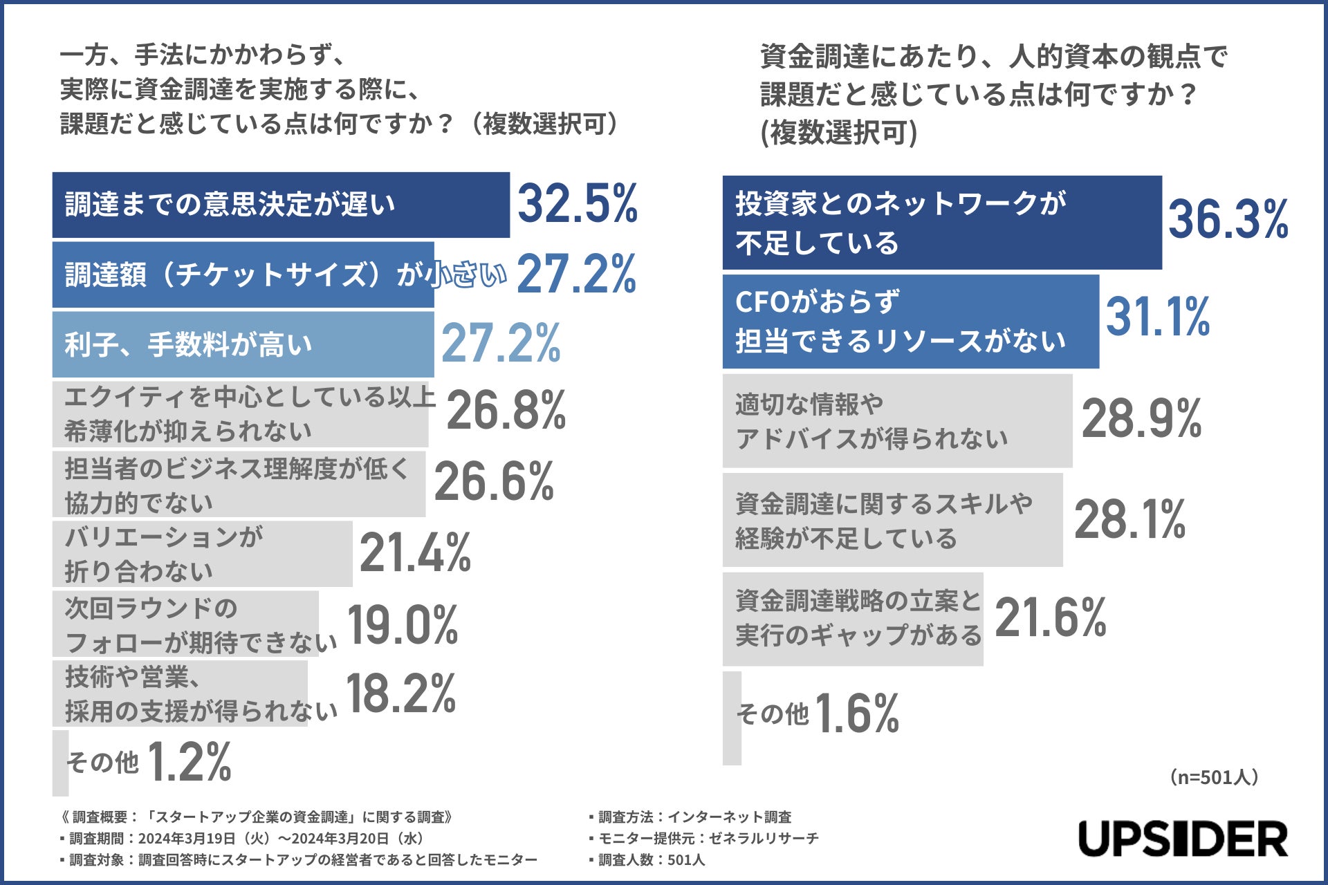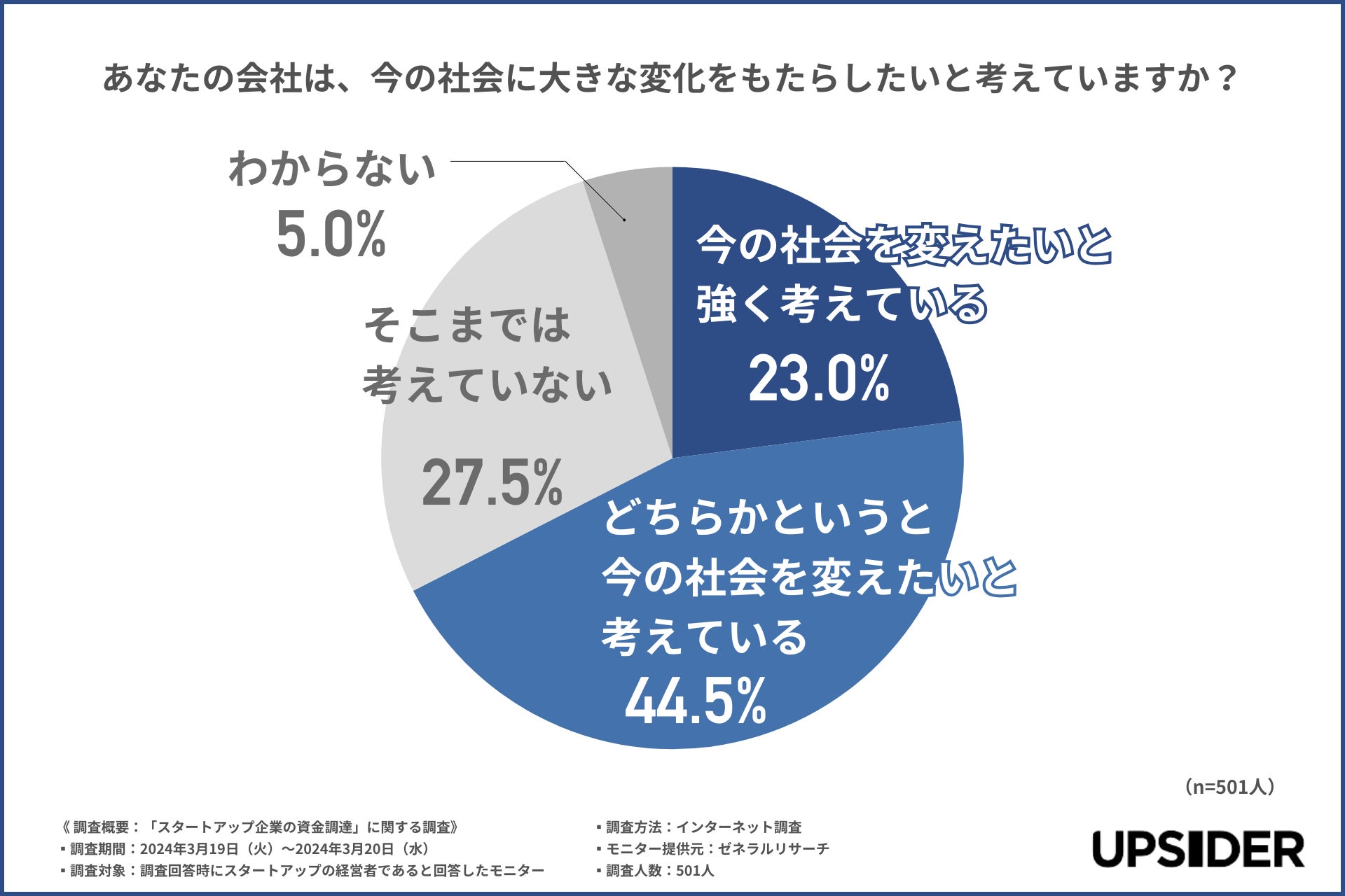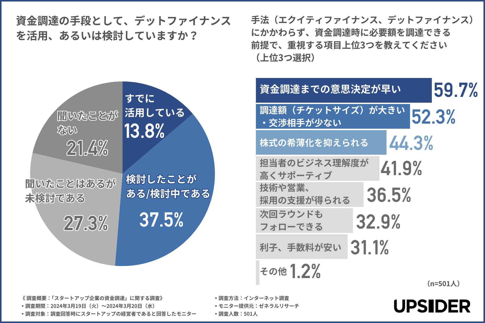 新規上場企業の20%以上が利用する法人カード*1「UPSIDER」(以下、UPSIDER)をはじめとする金融サービスを提供する株式会社UPSIDER(代表取締役:宮城徹・水野智規、本社:東京都港区、以下 当社)は、スタートアップの経営者(※個人事業主除く)を対象に、「スタートアップ企業の資金調達」に関するアンケート調査を実施しましたので、結果を報告します。