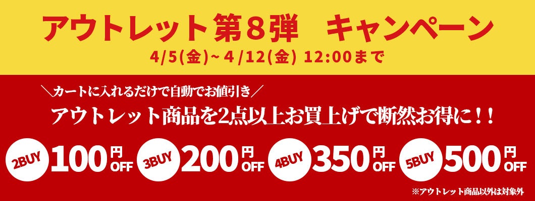 また、4月12日(金)12:00までの期間に対象のアウトレット商品を2点以上お買い上げいただくと割引になるキャンペーンを実施しています。