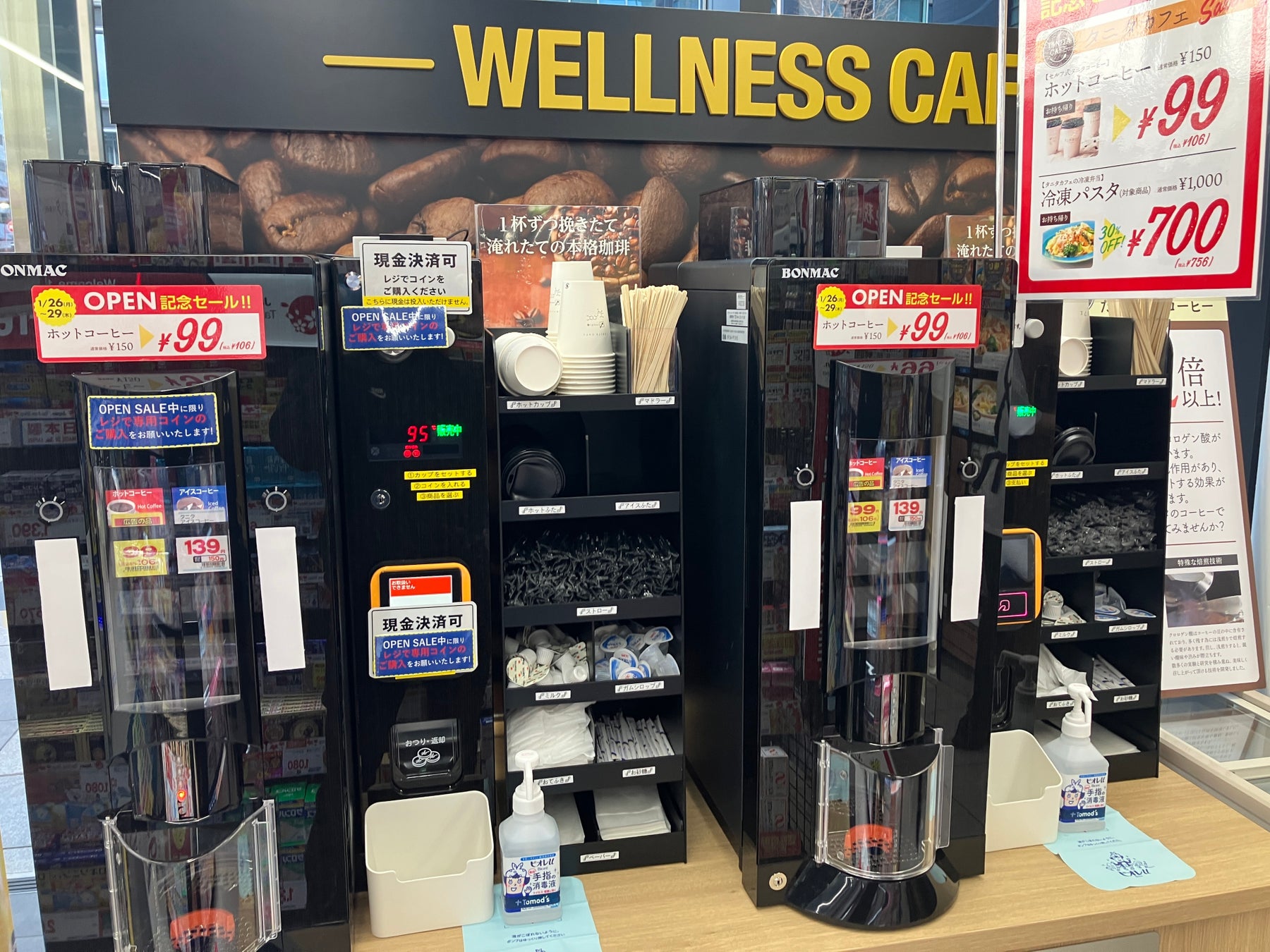 店内には「タニタカフェ」を設置しております。健康志向の冷凍弁当の自動販売機や、タニタのコーヒーマシン(アイス・ホット)を備えており、全自動マシンで抽出したできたてのタニタコーヒーをその場でお楽しみいただけます。