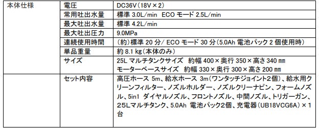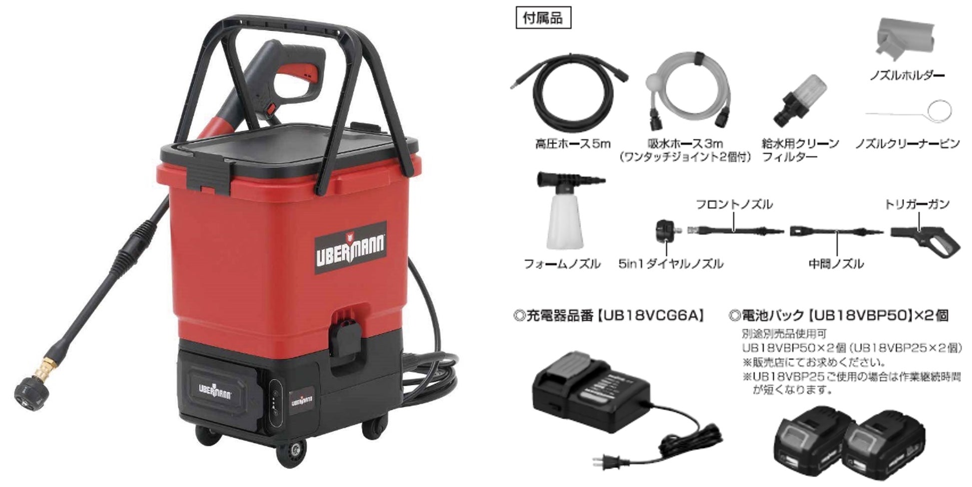 コメリのプロ向け、本格仕様のオリジナルブランド 「UBERMANN(ウーバマン)」から、電源いらず、水道いらずでどこでも使える「36V充電式高圧洗浄機 タンクセット」
