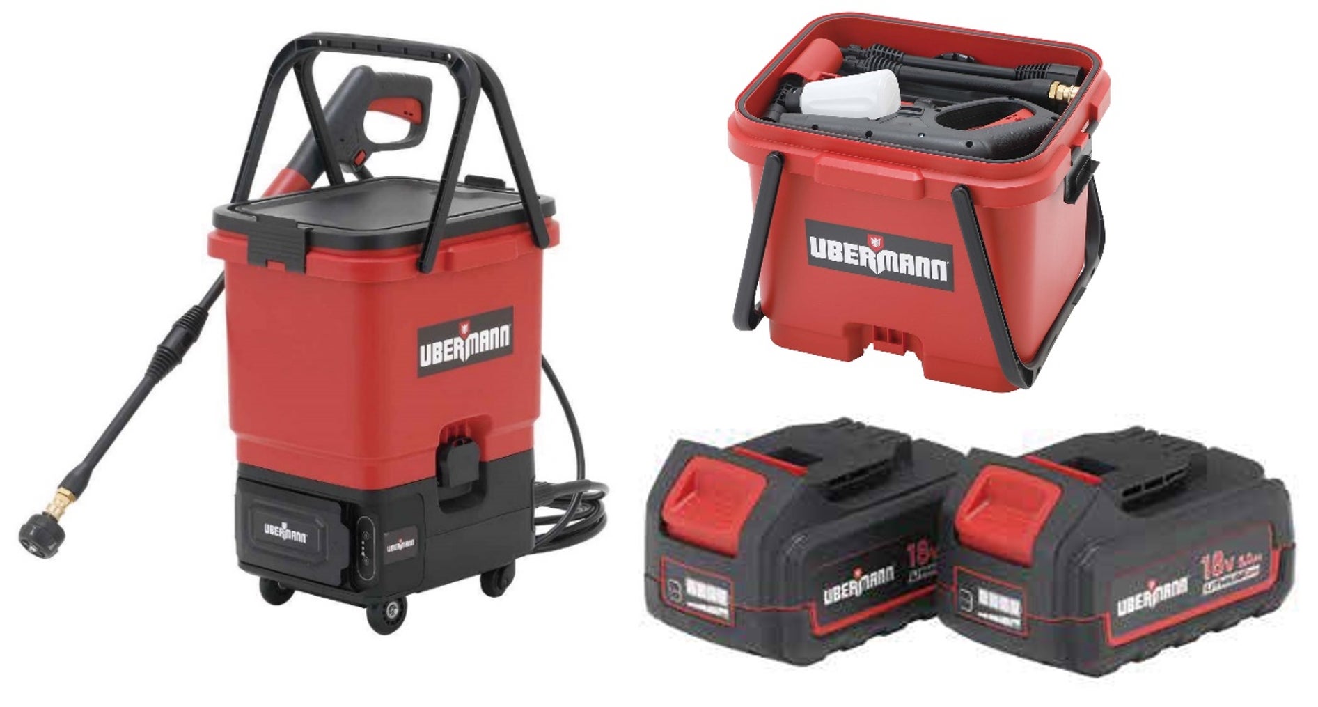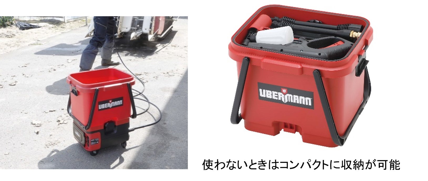 「UBERMANN」(ウーバマン)は、2021年6月より展開しているプロやセミプロといった上級者向けのスペックのバッテリーシェアタイプの電動工具シリーズです。今回新しくラインナップに加わる「36V充電式高圧洗浄機 タンクセット」は、バッテリーの電力で使用する電源不要のコードレスタイプの高圧洗浄機です。タンクに水を入れて使用することできるため、水道の無い場所でも使用できます。また、タンクの中にホースやノズルを入れることで、コンパクトに収納ができます。