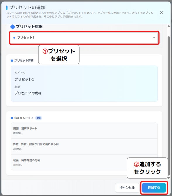 プリセットを見るボタンをクリックして追加するだけで、複数のアプリが一括で設定され、初期設定の手間をかけずに「スクールAI」をすぐに活用できます。