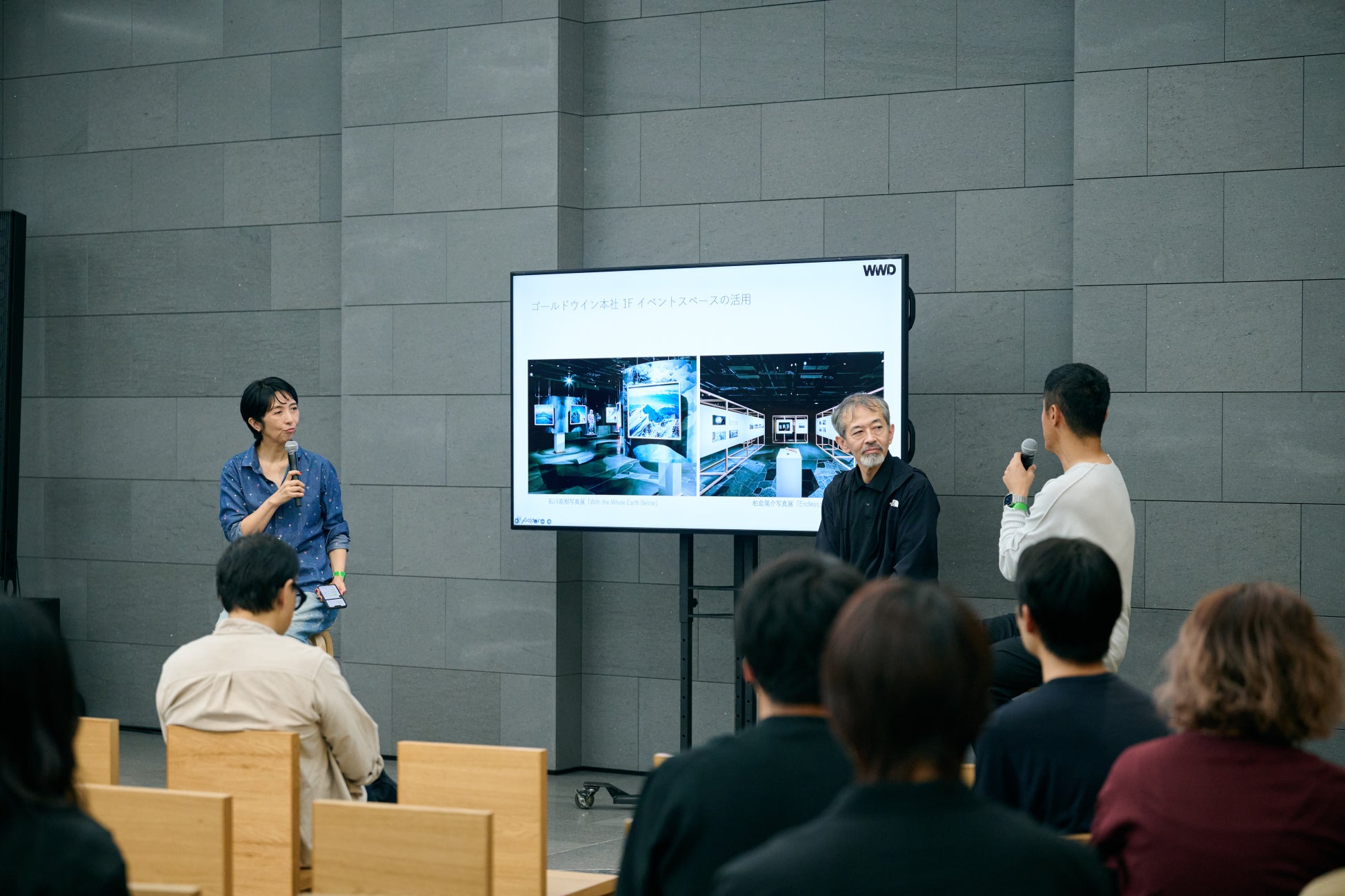 株式会社ゴールドウィンとパナソニック株式会社が共同開発した「ダウンジャケットコース付き新型洗濯機」とサステナビリティをテーマに、会場にてトークショーを開催。登壇者はゴールドウィン総合企画本部マーケティング部長の山屋光司氏、パナソニック ドラム洗商品企画課の國司有香氏、そして「WWDJAPAN」サステナビリティディレクターの向千鶴。