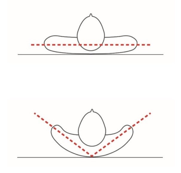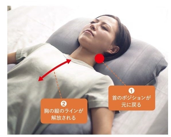 脱力まくらは、頭の付け根の部分に安定感をつくり、まくらの中央部のくぼみによって、重い頭を支えている筋肉(後頭下筋群)の力を抜きやすいようになっています。これにより、自然と背骨と首は「人間が本来持つポジション」に。胸が解放されることで、呼吸はスムーズになり、体は脱力状態へと導かれます。