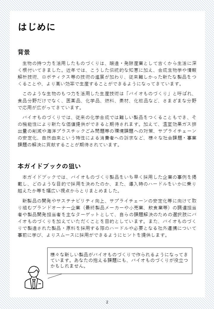 本ガイドブックは、自治体のご担当者を主な読み手として、新たな産業であるバイオものづくりについて解説をするとともに、それによって生み出される製品が地域課題や社会課題にどのように貢献できるかをご紹介します。また、それら製品導入時の課題を解消するヒントを提供します。