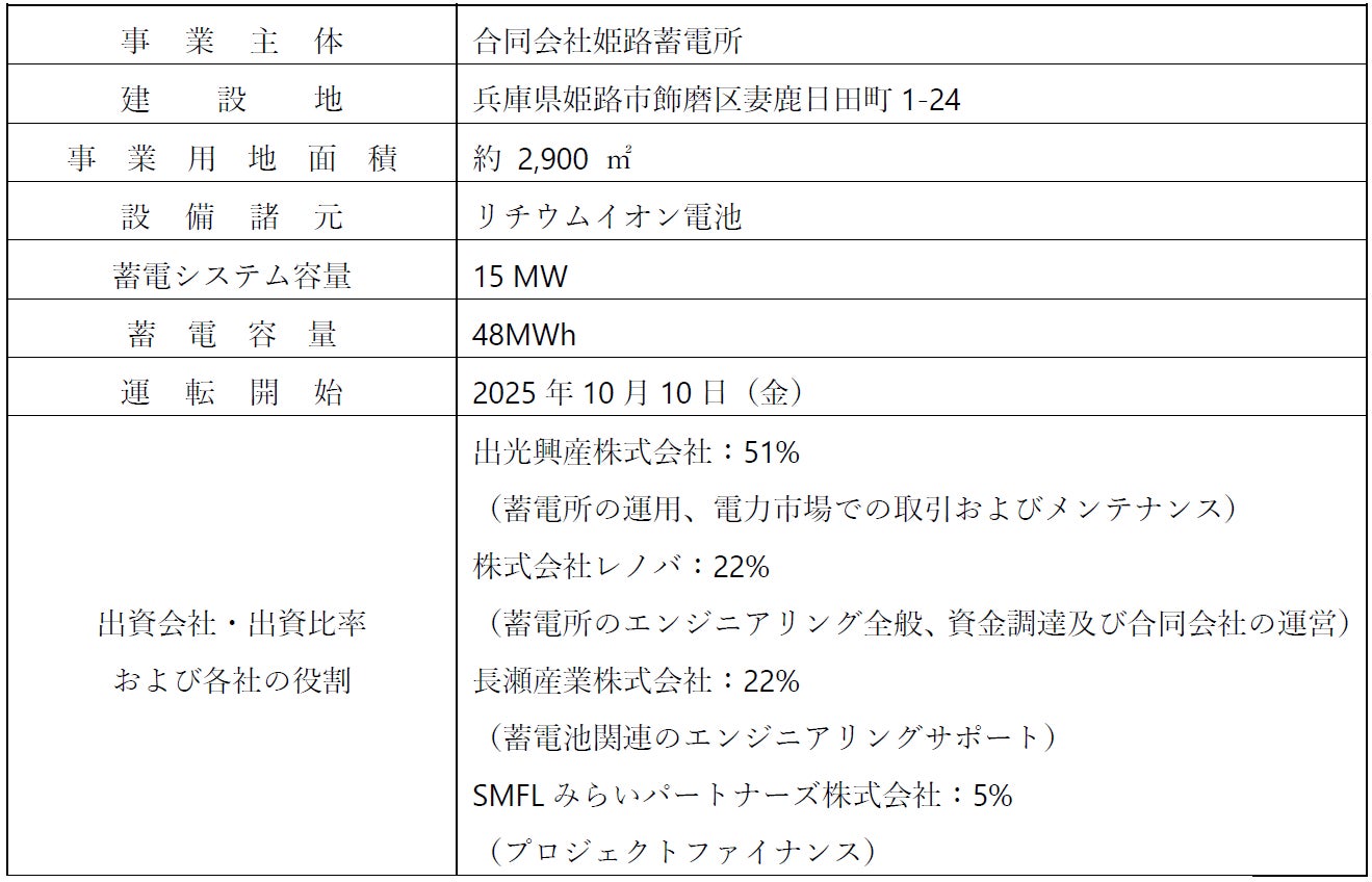 三井住友ファイナンス&リース株式会社(代表取締役社長:今枝 哲郎、以下「SMFL」)は、戦略子会社のSMFLみらいパートナーズ株式会社(代表取締役社長:上田 明)が、出光興産株式会社(代表取締役社長:酒井 則明)、株式会社レノバ(代表取締役社長CEO:木南 陽介)、長瀬産業株式会社(代表取締役社長:上島 宏之)と共同出資により設立した合同会社姫路蓄電所を通じ開発した「姫路蓄電所」(以下「本蓄電所」)が、2025年10月10日付で運転を開始したことをお知らせいたします。