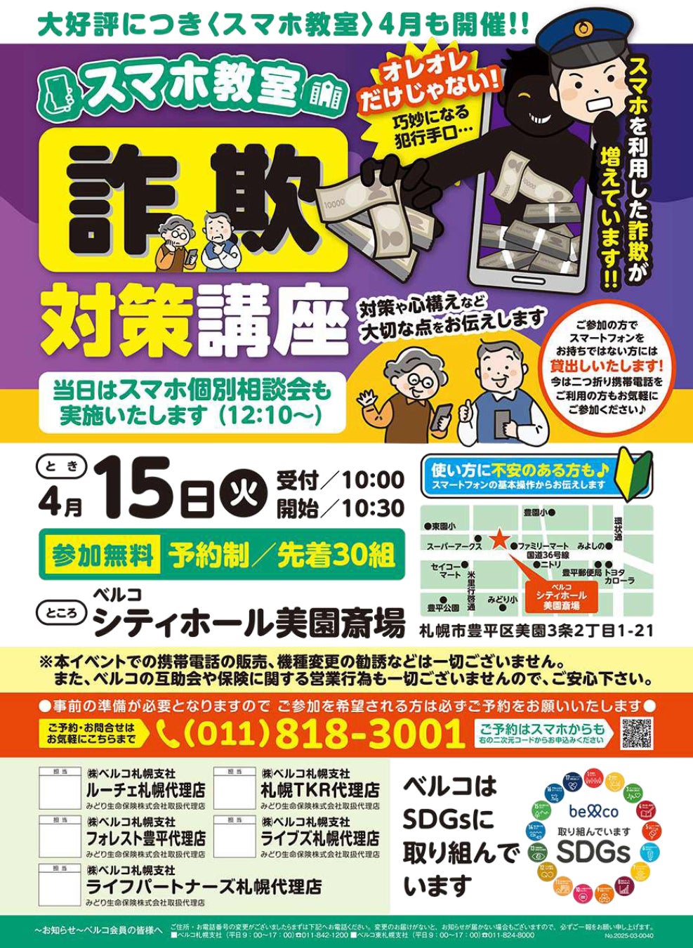 冠婚葬祭を通じて地域社会に貢献する株式会社ベルコ(本社:大阪市北区)は、2025年4月15日(火)に、CH美園斎場(札幌市豊平区)にて、「スマホ教室 ~詐欺対策講座~」を開催いたします。