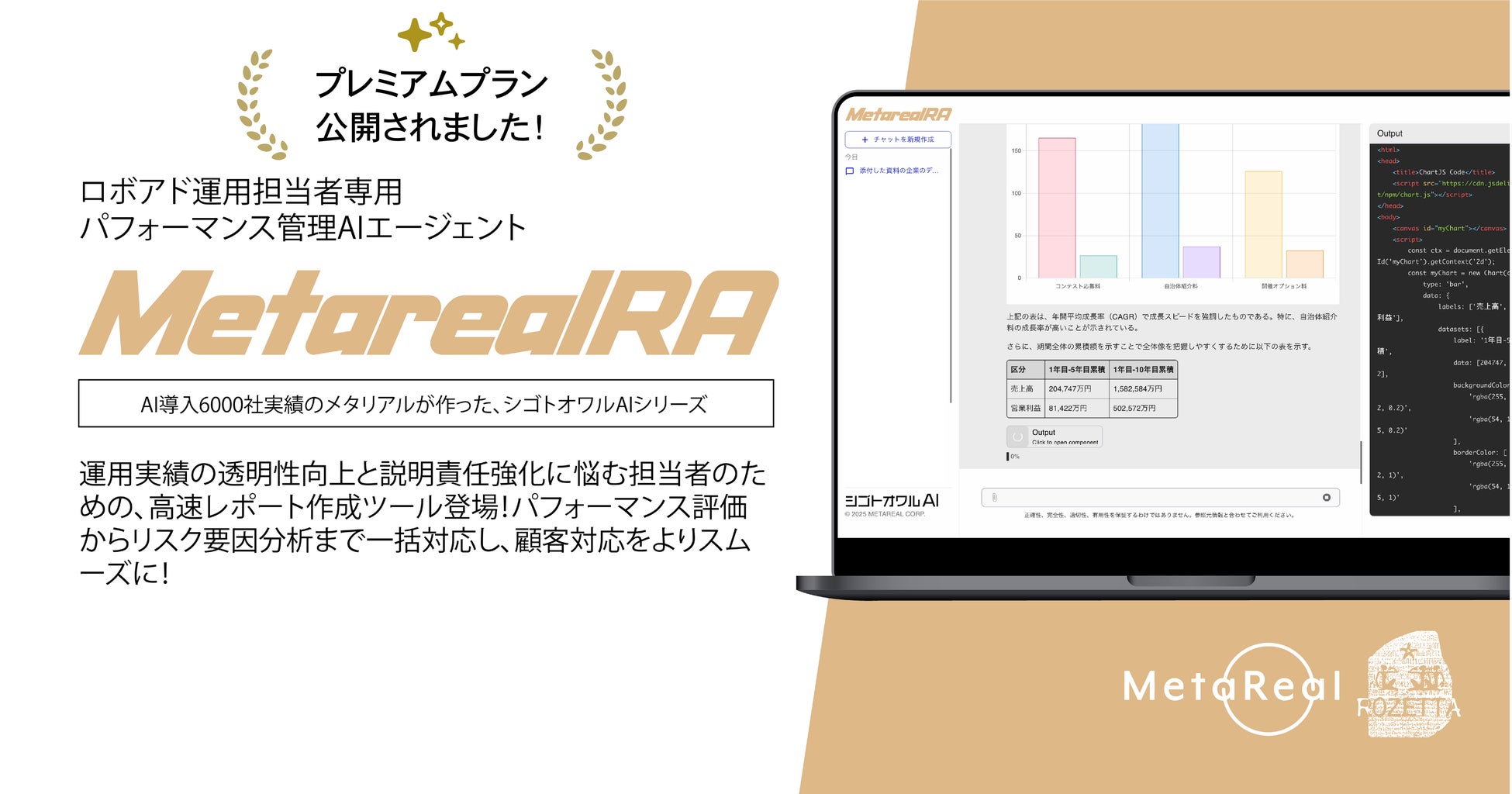 業種特化の専門AI開発・運営を行う株式会社メタリアル(本社:東京都千代田区、代表取締役:五石順一)は、2025年6月27日(金)、“AIは高い”常識を覆すAIパフォーマンス管理エージェント「Metareal ロボアドバイザー(以下、Metareal RA)」に『プレミアムプラン』を提供開始しました。プレミアムプランは月額5万円(税込)で1日20回・月200回分析し放題、レポート作成時間を削減し、決算直前の説明責任と残業を同時に解消します。