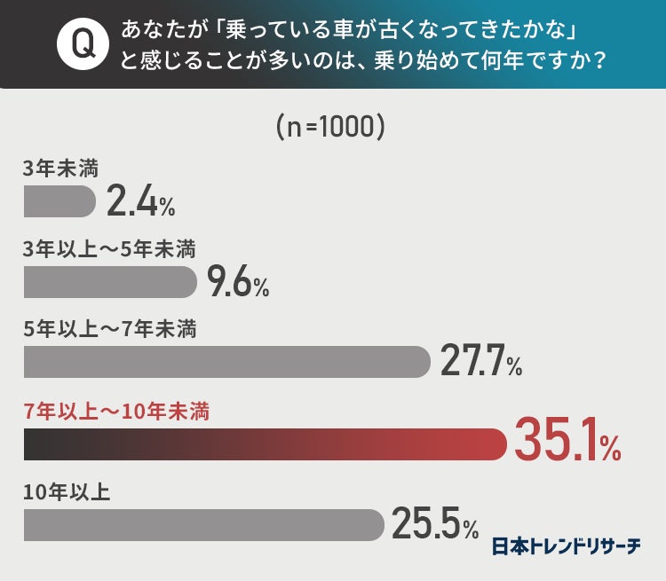 続いて、「乗っている車が古くなってきたかな」と感じることが多いのは、乗り始めて何年くらい経った頃かについて聞きました。