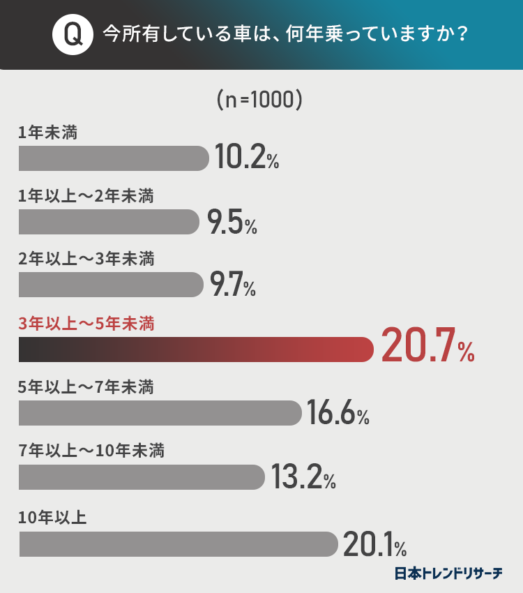 まずは、今所有している車は何年乗っているかについて聞きました。