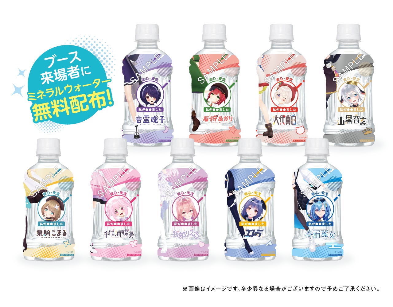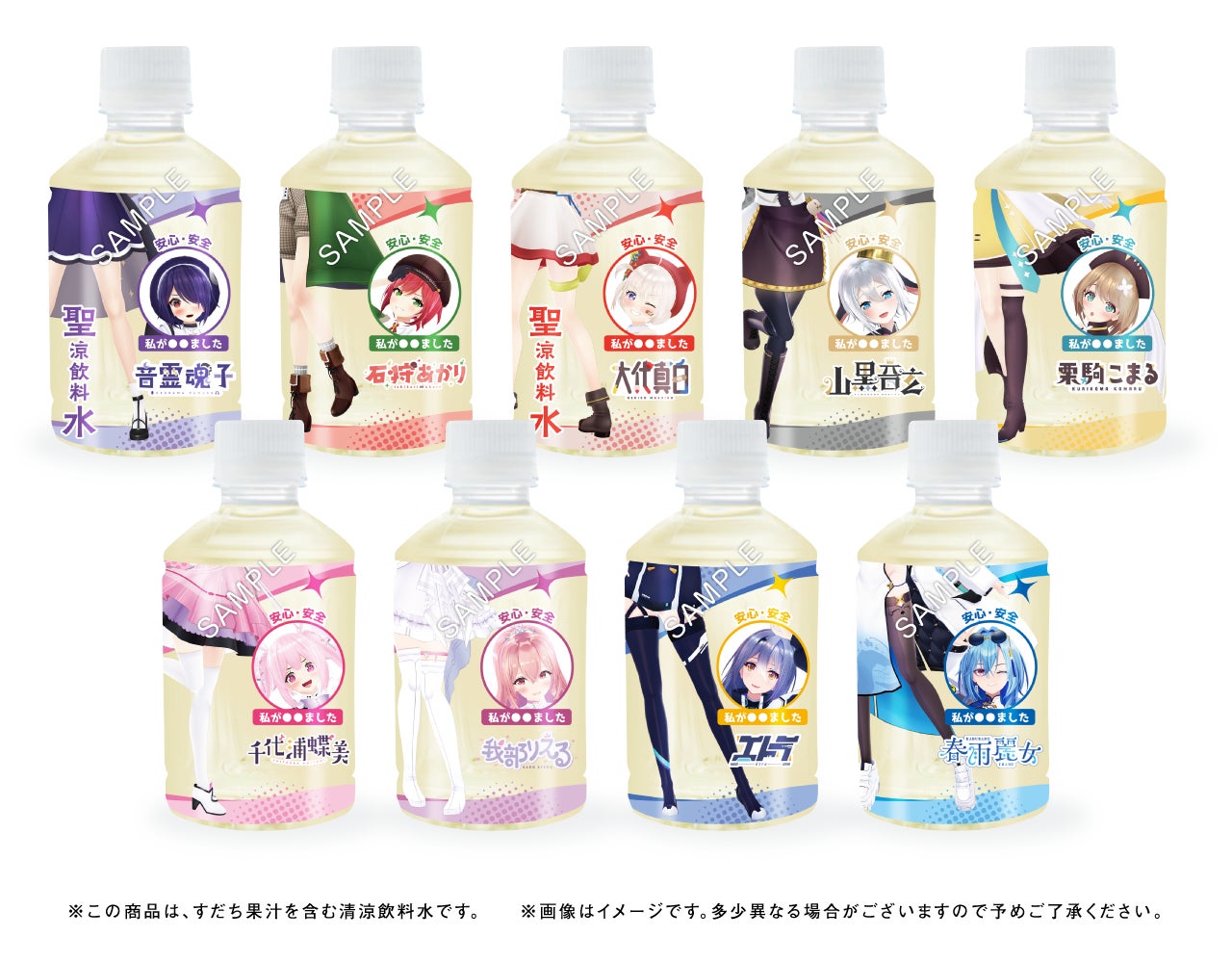 ボトルデザインは音霊魂子、石狩あかり、大代真白、山黒音玄、 栗駒こまる、千代浦蝶美、我部りえる、エトラ、春雨麗女の9種類。お好きなデザインをお選びいただけます。