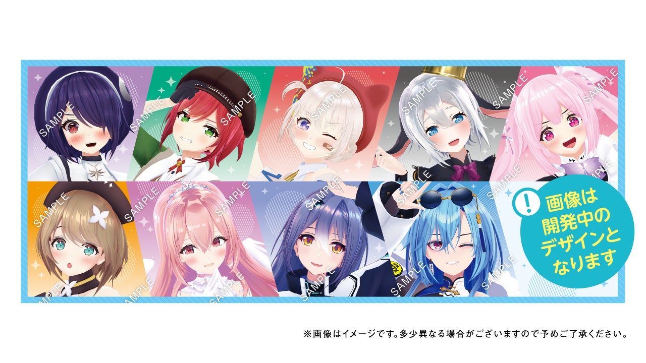 音霊魂子、石狩あかり、大代真白、山黒音玄、 栗駒こまる、千代浦蝶美、我部りえる、エトラ、春雨麗女、9人のメンバーをあしらったフェイスタオルです。