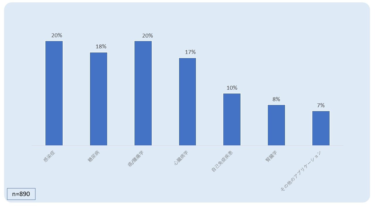 - 用途別では、体外診断用医薬品は感染症(20.2%)、がん(20.2%)、糖尿病(18%)、心臓病(16.9%)に多く使用されています。残りの回答は、自己免疫疾患(10.1%)、腎臓学(7.9%)、その他の用途(6.7%)で占められています。