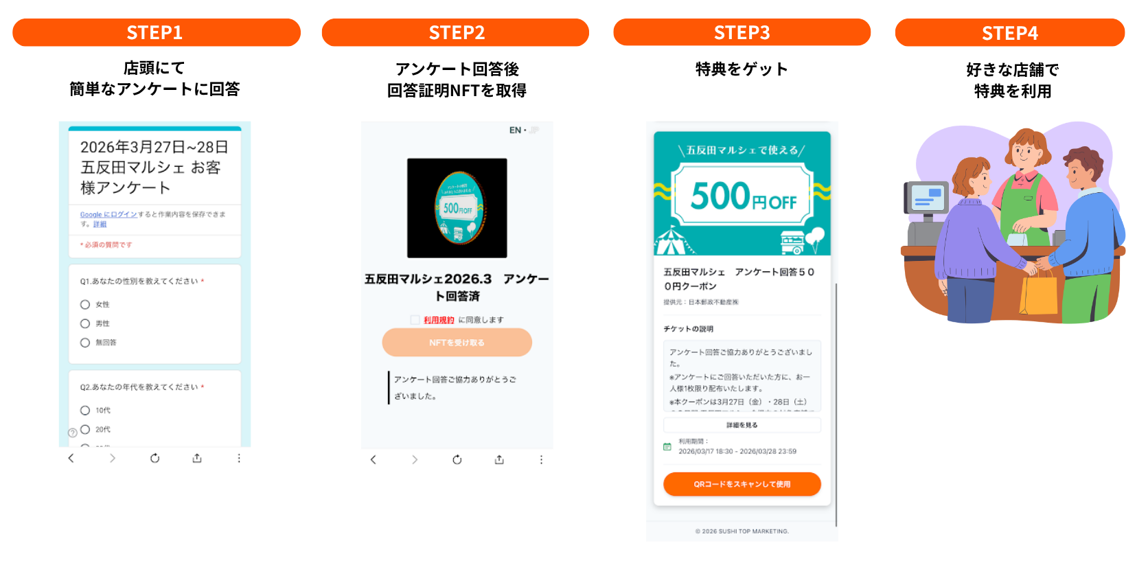 SUSHI TOP MARKETING株式会社(本社:東京都千代田区、代表取締役CEO:徳永 大輔、以下「当社」)は、日本郵政不動産株式会社(東京都千代田区、代表取締役社長:池田 明)が五反田JPビルディングにて開催する「五反田マルシェ」において、NFTの配布から分析まで一貫して行うことのできる「トークングラフマーケター」を提供し、来場促進・施設内回遊の実証実験を2回にわたり実施しました。