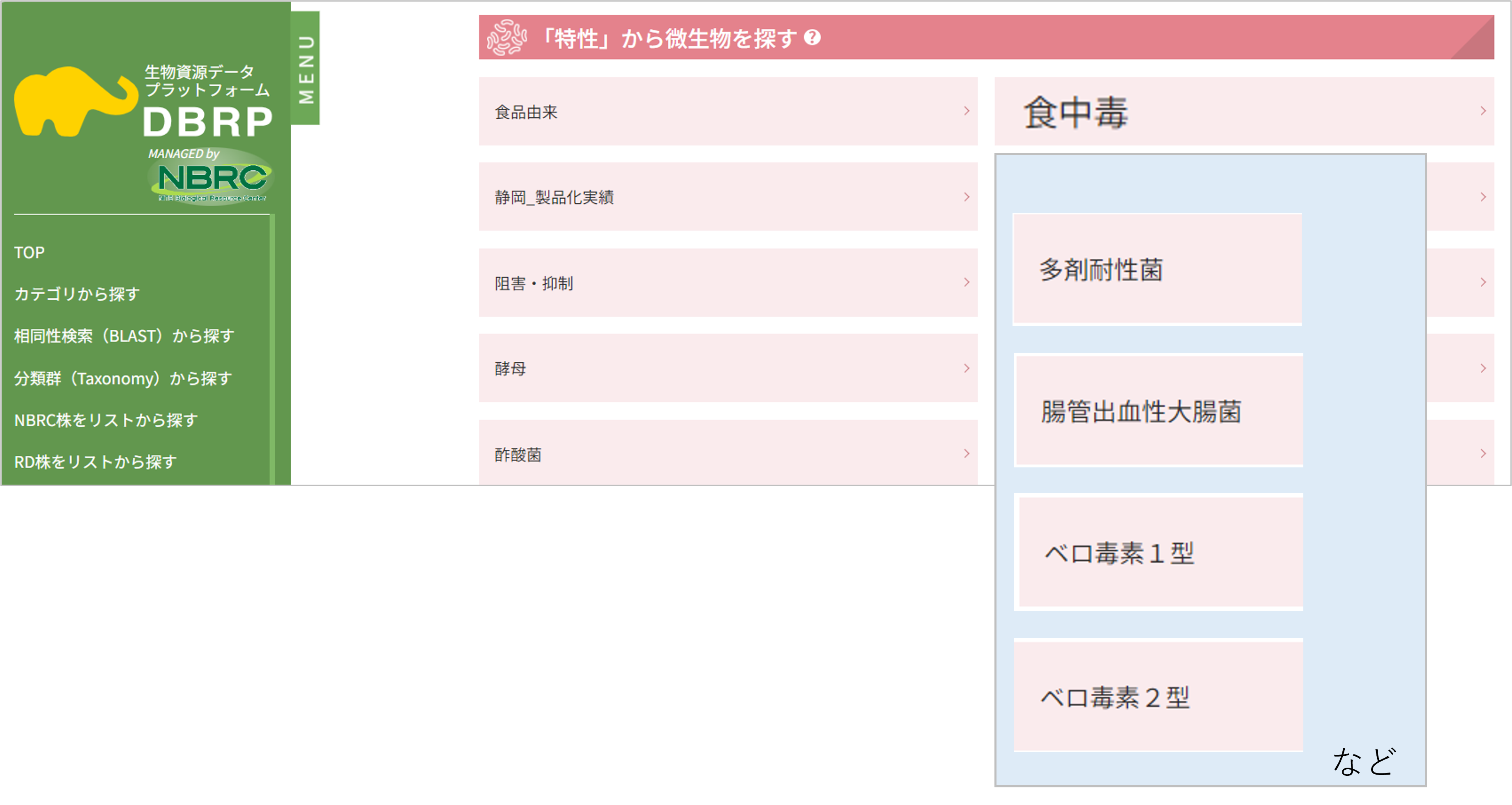 DBRP「カテゴリから探す」https://www.nite.go.jp/nbrc/dbrp/category