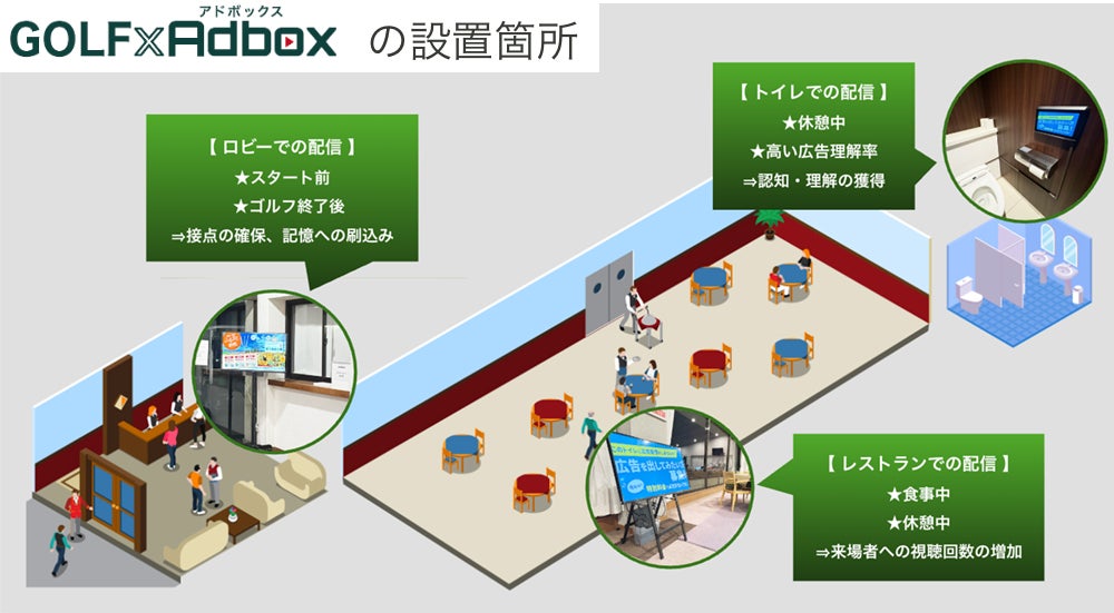 「アドボックス」とは、ゴルフ場をはじめとする商業施設内の個室空間に【無償で】デジタルサイネージを設置し、 来場者に向けて発信を行い最大限に情報を認知させることで、【ターゲット層へのダイレクトなアプローチ】を実現できる広告配信サービスです。