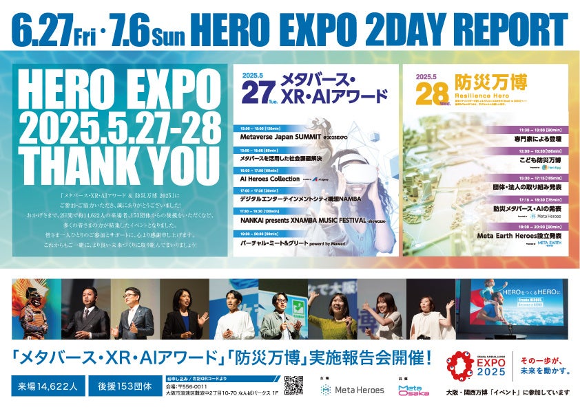 株式会社Meta Heroesは「Society 5.0 × SDGs × HERO」をテーマに事業を展開。主にメタバース(XR)やAIを活用した開発やDX教育施設『Hero Egg』の運営、そして半年で15000名を超えるAIの企業研修を行うと同時に教育・防災・地方創生など社会課題の解決に取り組む企業です。2025年5月大阪・関西万博のEXPOホールにて「AI/メタバースアワード」および「防災万博」を主催。2日間で延べ15,000人が来場し、全国153の自治体・教育機関・団体から後援を受けた大規模イベントとして成功を収めている。