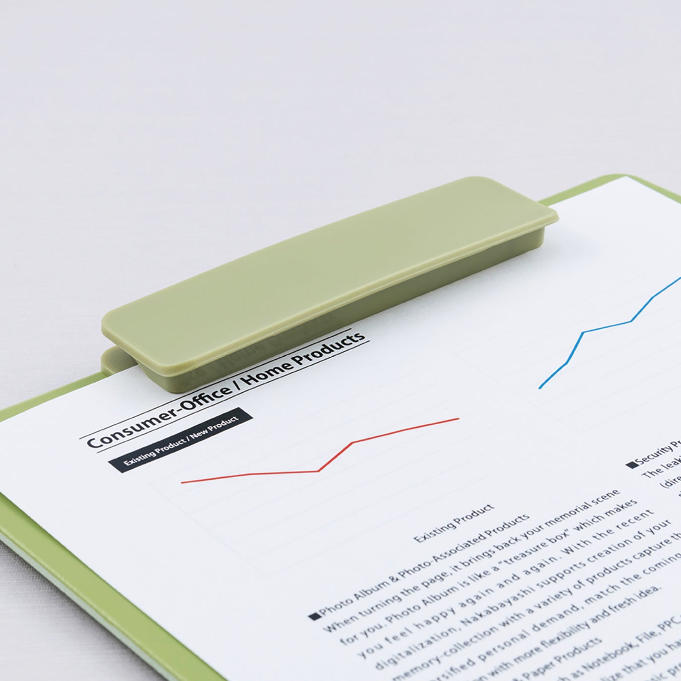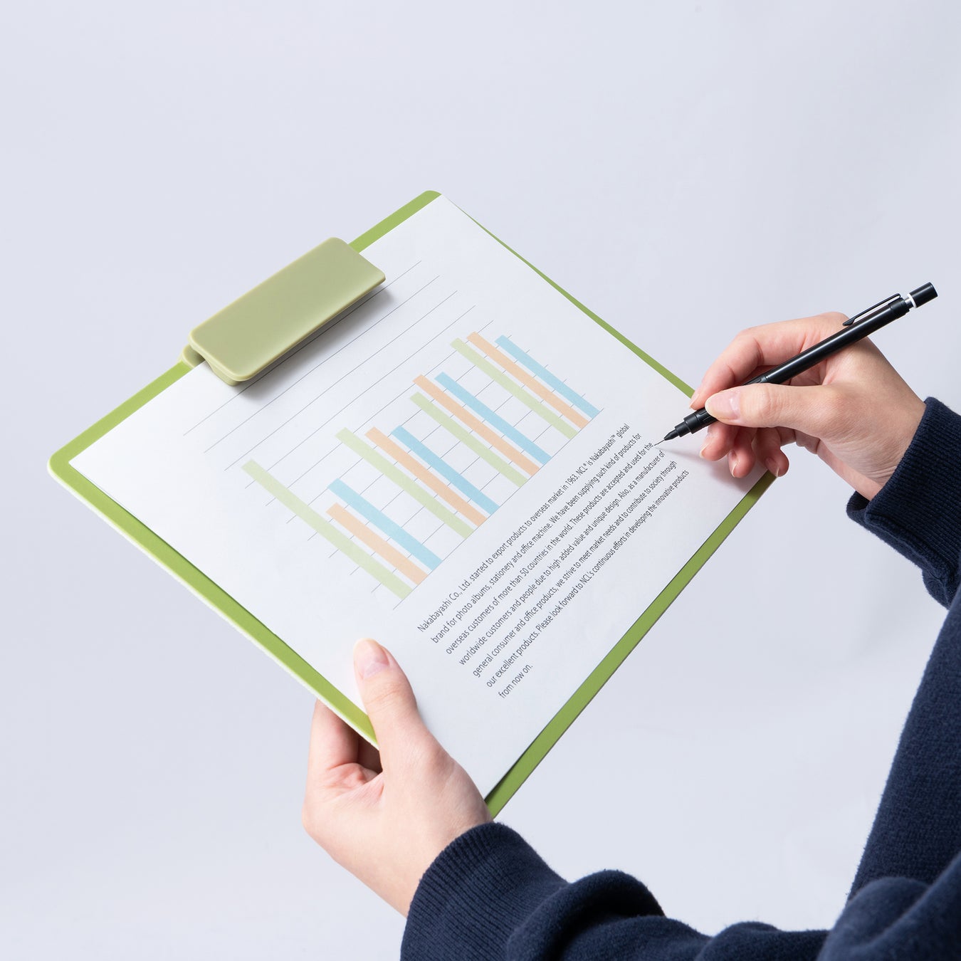 従来のクリップボードと異なり、クリップがタテ・ヨコに移動する「移動式クリップ綴具」を採用しているため、書類の向きを気にせず使用することができます。また、金属製クリップの上には、開け閉めがかんたんにできる樹脂製のワイドクリップカバーが付いています。今まで2種類のクリップボードを用意していた方や、仕方なく向きの違うクリップボードを使用していた方でも、シフテがあれば、この製品ひとつで常に効率の良い形状で作業することができます。