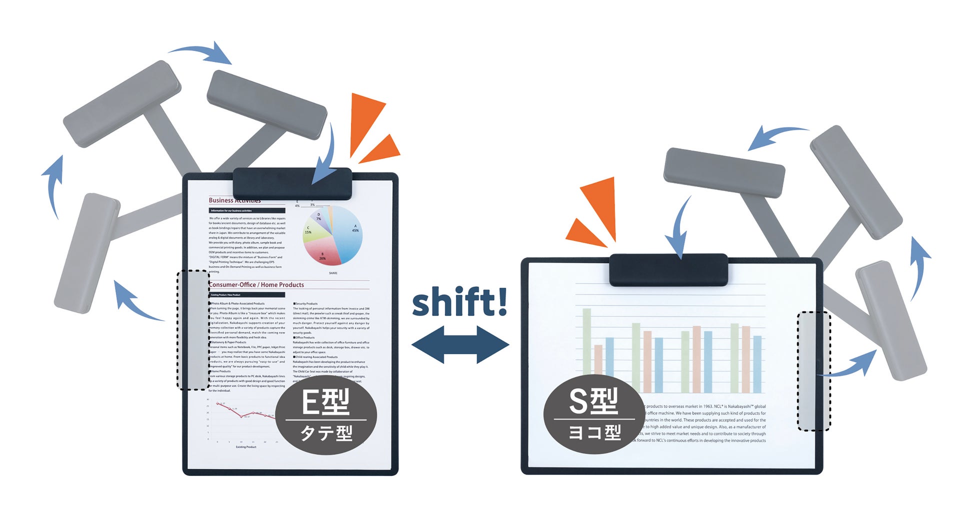 「シフテ」は、書類に合わせてタテ向き(E型)・ヨコ向き(S型)を使い分けることができるタテヨコ兼用のクリップボードです。