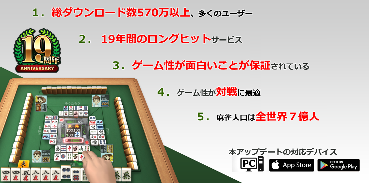 2004年の運営開始より19年以上の運営実績を経て、累計570万以上の会員を獲得しているオンライン麻雀アプリです。