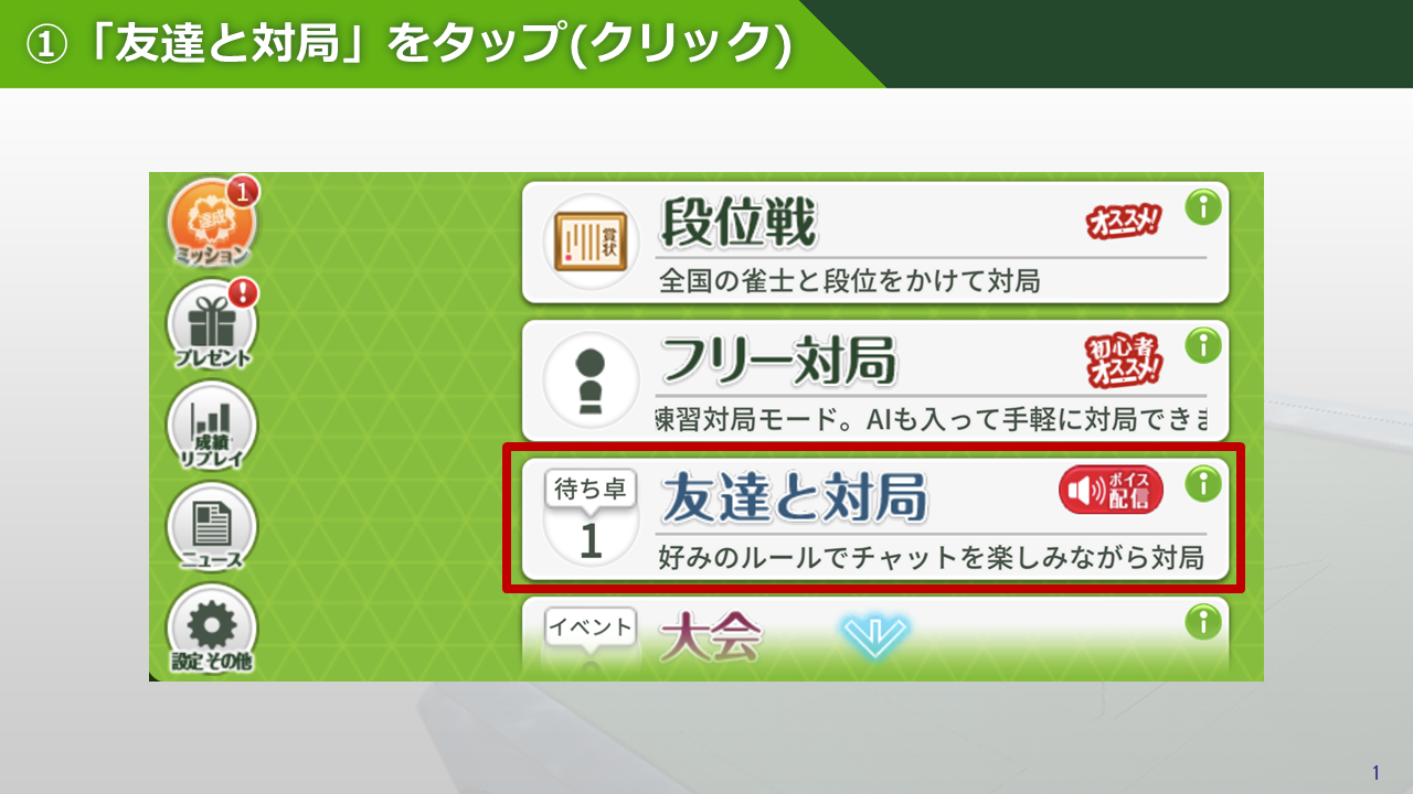 ①ジャンナビアプリを起動後、「友達と対局」を開く
