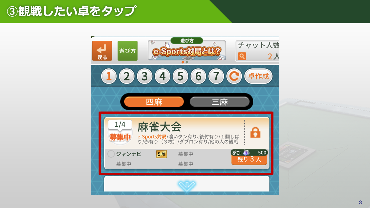 ③観戦したい卓をタップ