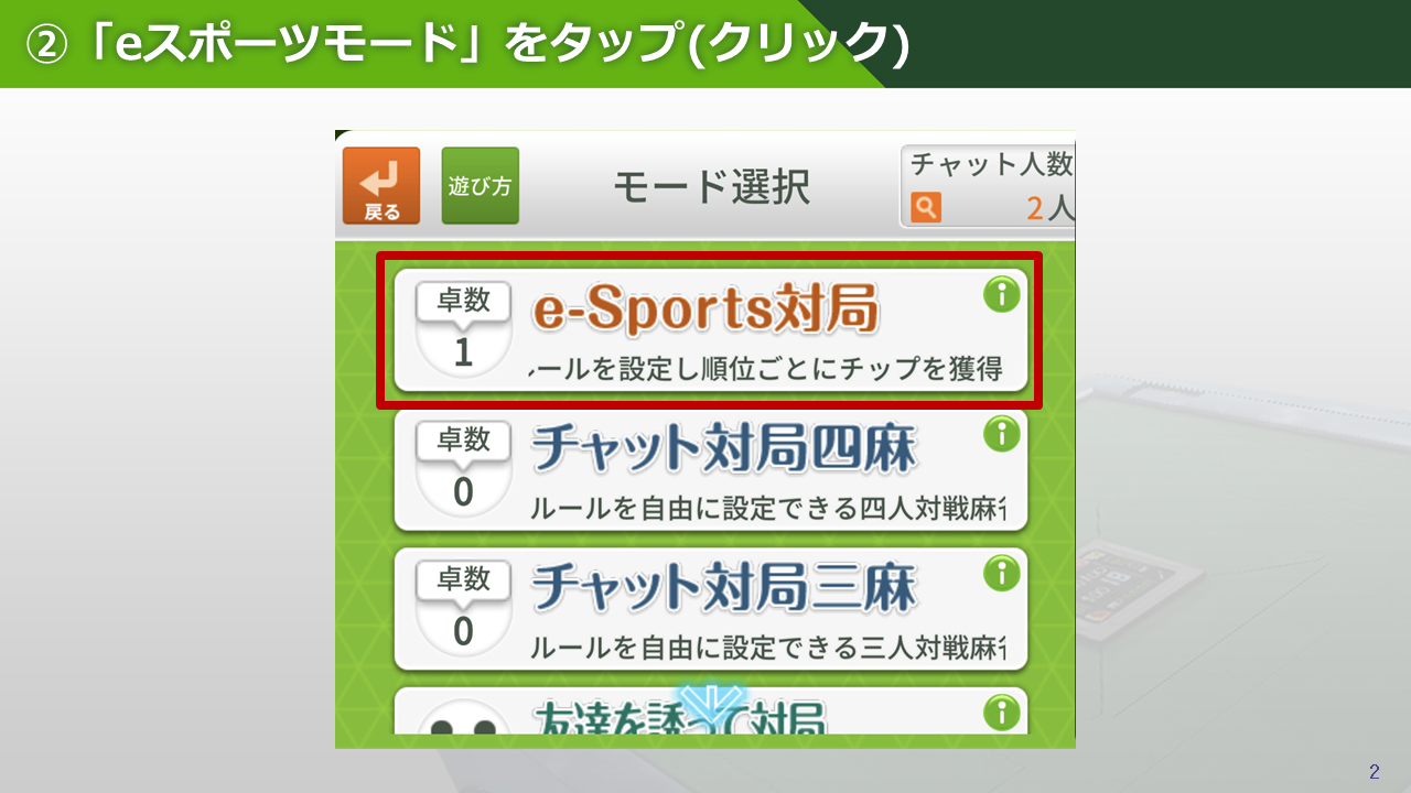ジャンナビアプリ内「友達と対局 e-Sports対局」(観戦手順は後述)