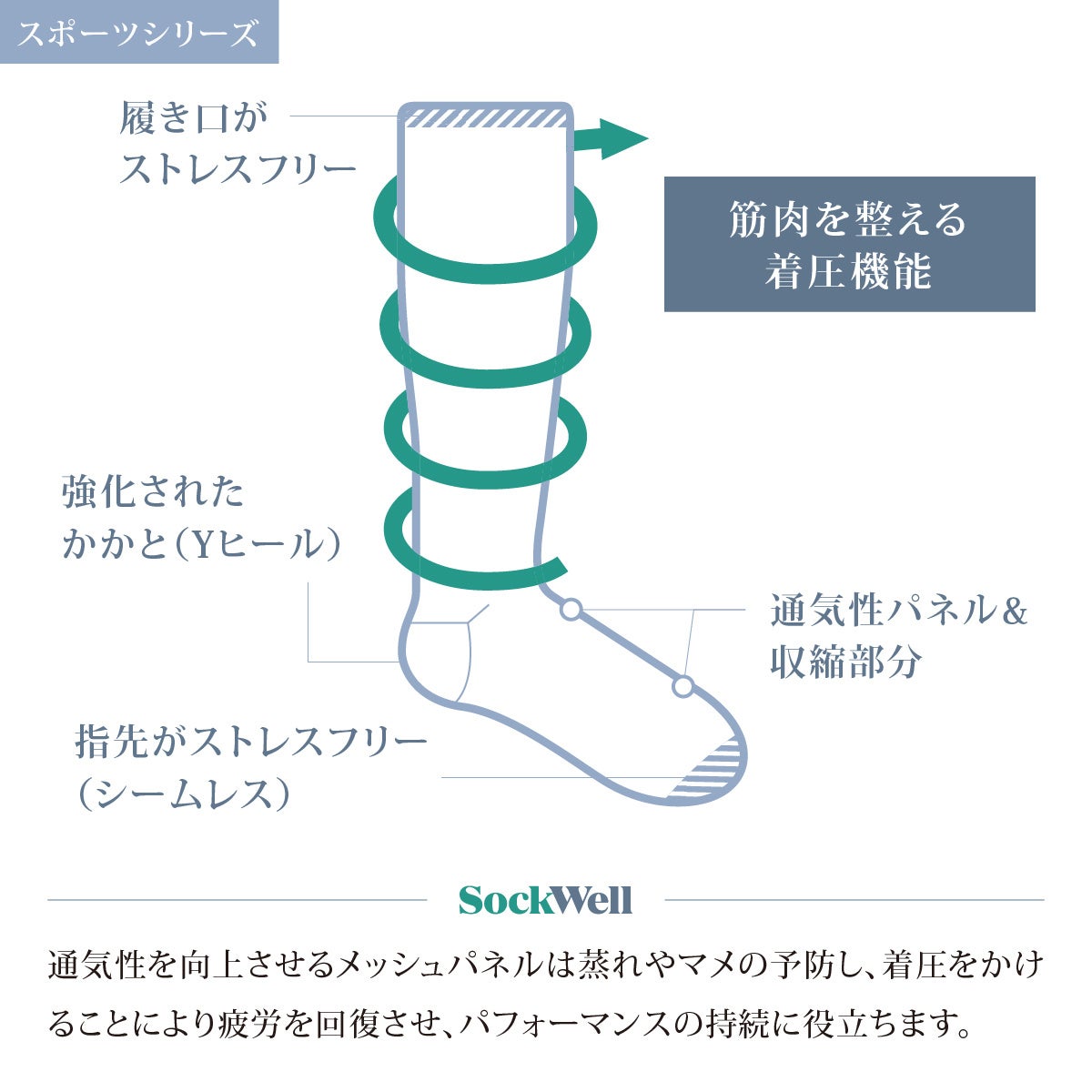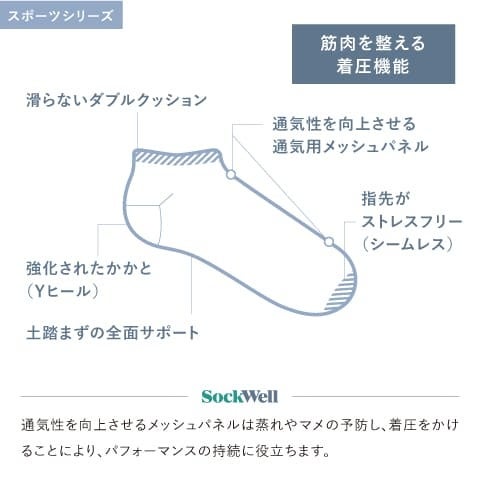 シンプルながらも、ソックウェルらしいこだわりを感じるデザイン。活動的に動く大人に履いてほしいスポーツ時におすすめの着圧ソックスです。
