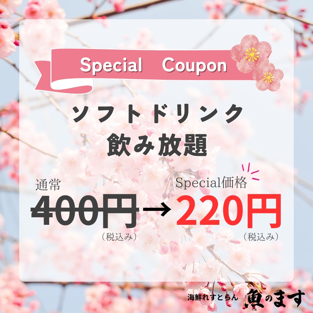 ■「スペシャルクーポン発行!」ソフトドリンク飲み放題を400円→220円!!