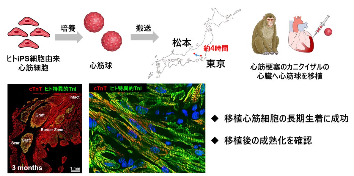 信州大学医学部再生医科学教室の柴祐司教授、同医学部循環器内科学教室の桑原宏一郎教授(以下、信州大)、慶應義塾大学医学部内科学教室(循環器)(以下、慶應大)の遠山周吾講師、福田恵一名誉教授らの研究グループは、Heartseed株式会社との共同研究により、臨床治療用のヒト人工多能性幹細胞(iPS細胞)から心筋球を作製し、心筋梗塞を発症させたカニクイザルの心臓に移植したところ、移植した心筋細胞が長期に渡って生着し、サルの心機能を回復させることに成功しました。また、従来の報告と比較して移植後に発生する心室性不整脈の副作用が格段に少ないことを明らかにしました。