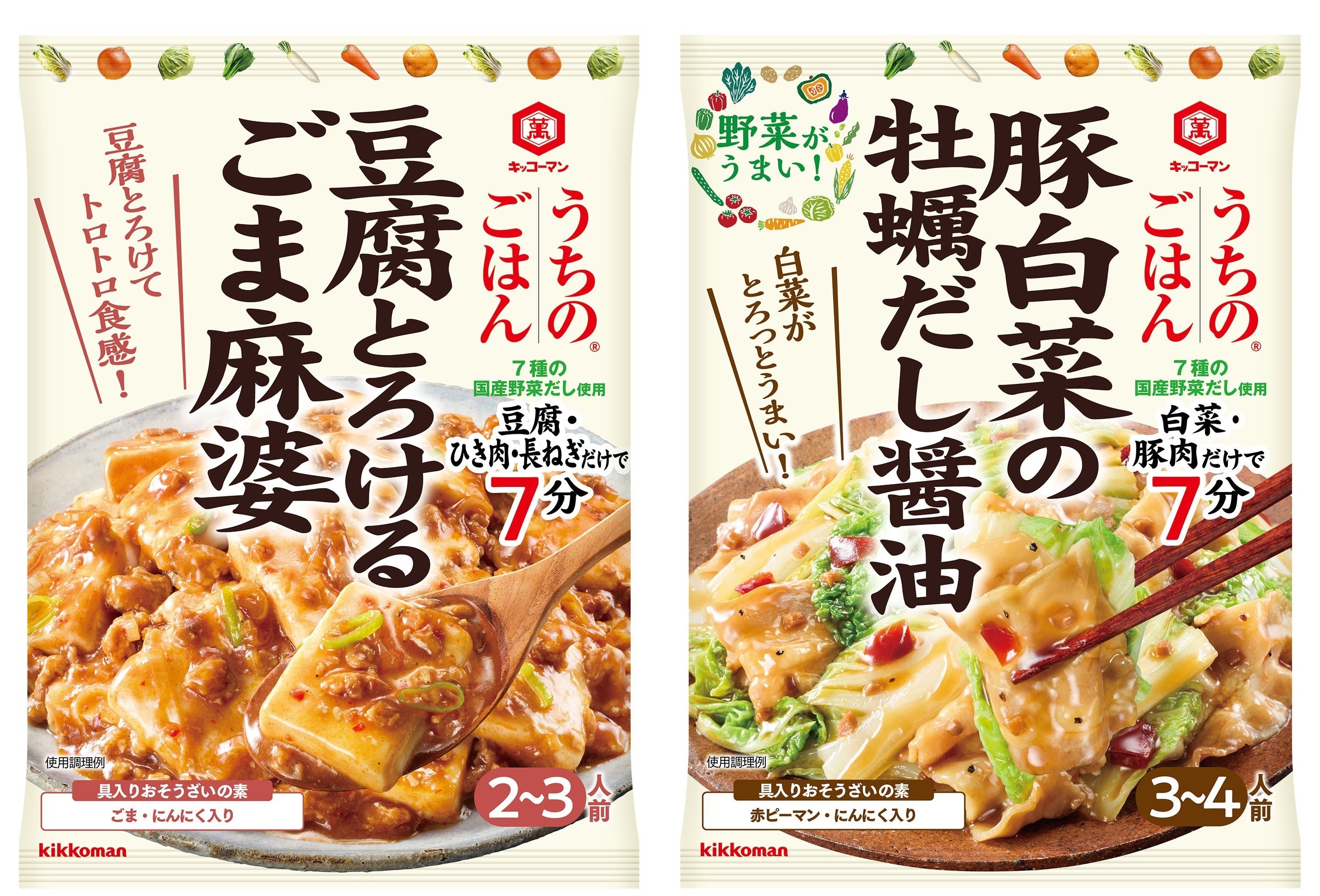キッコーマン食品株式会社は、8月4日に、「キッコーマン うちのごはん おそうざいの素」シリーズの新アイテム「豆腐とろけるごま麻婆」と「豚白菜の牡蠣だし醤油」を全国で新発売します。