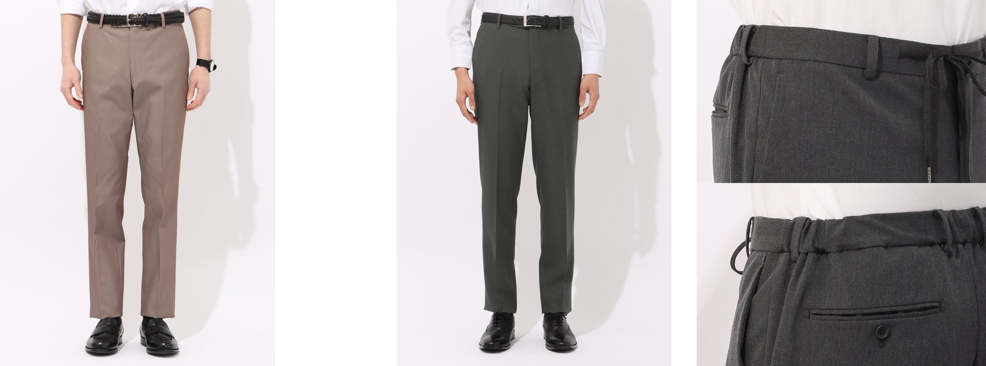 スーツ作りで培った縫製や立体感のあるシルエット、緩やかなテーパードデザインに加えて、特殊加工により洗濯してもクリース(左右中央の折り目)が消えずきちんと感を演出。接触冷感機能を備えたモデルやドローコードタイプも展開。